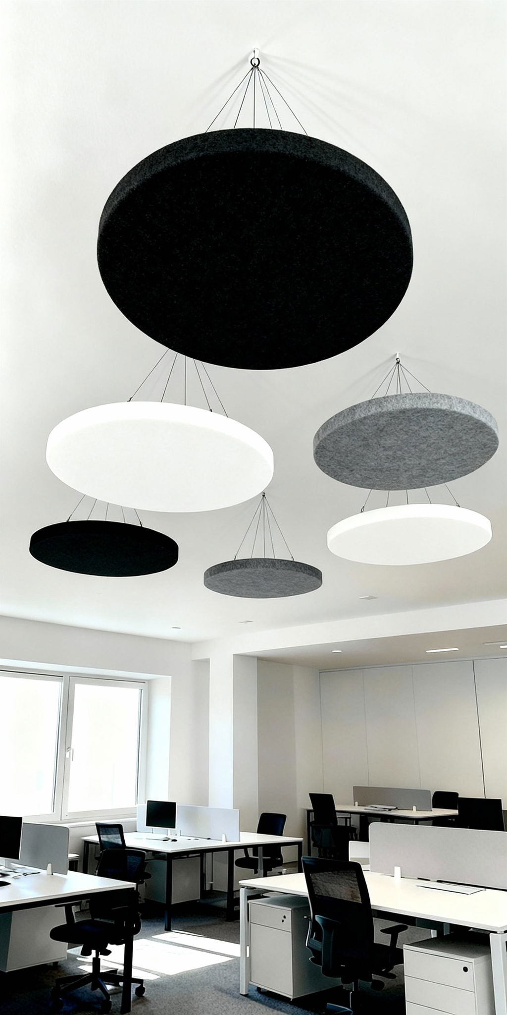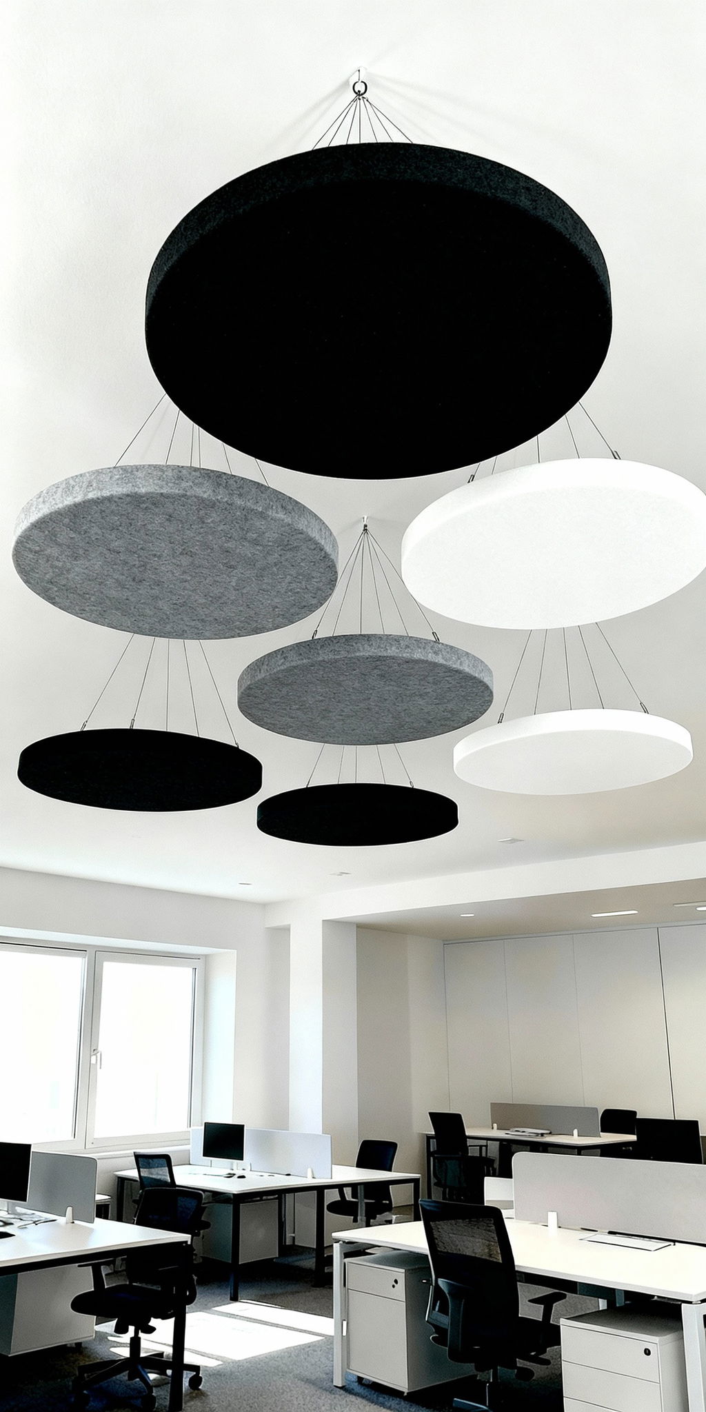 PES Circle Ceiling är särskilt effektiv mot ljudreflektioner som uppstår i takytor. Genom att hänga fritt med vajer bryts ljudvågorna redan innan de reflekteras tillbaka i rummet. Resultatet blir en tydlig minskning av efterklang och eko – särskilt i öppna kontorslandskap, klassrum, konferensrum och andra miljöer där en bra ljudmiljö är avgörande. Den runda ljudabsorbenten bidrar inte bara till bättre akustik, utan även till ett mjukt och harmoniskt intryck i rummet.