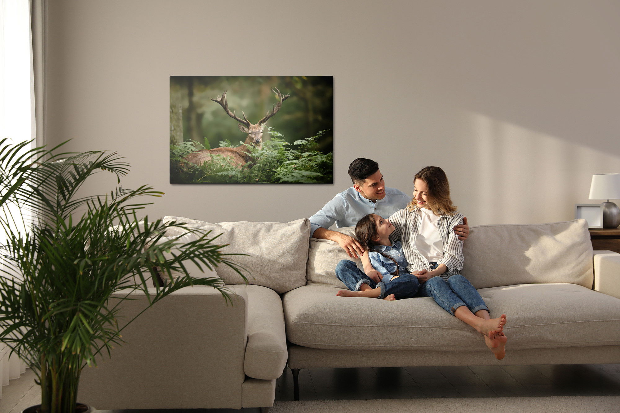 Motivet A deer in the green återges med hög färgprecision och detaljrikedom tack vare HP Latex-teknologi. Trycket sker med vattenbaserade, luktfria och GREENGUARD Gold-certifierade bläck som ger en upplösning på upp till 300 DPI. Färgerna är UV-beständiga och behåller sin styrka även i ljusa rum, vilket gör tavlan lämplig för både hem- och offentliga miljöer.