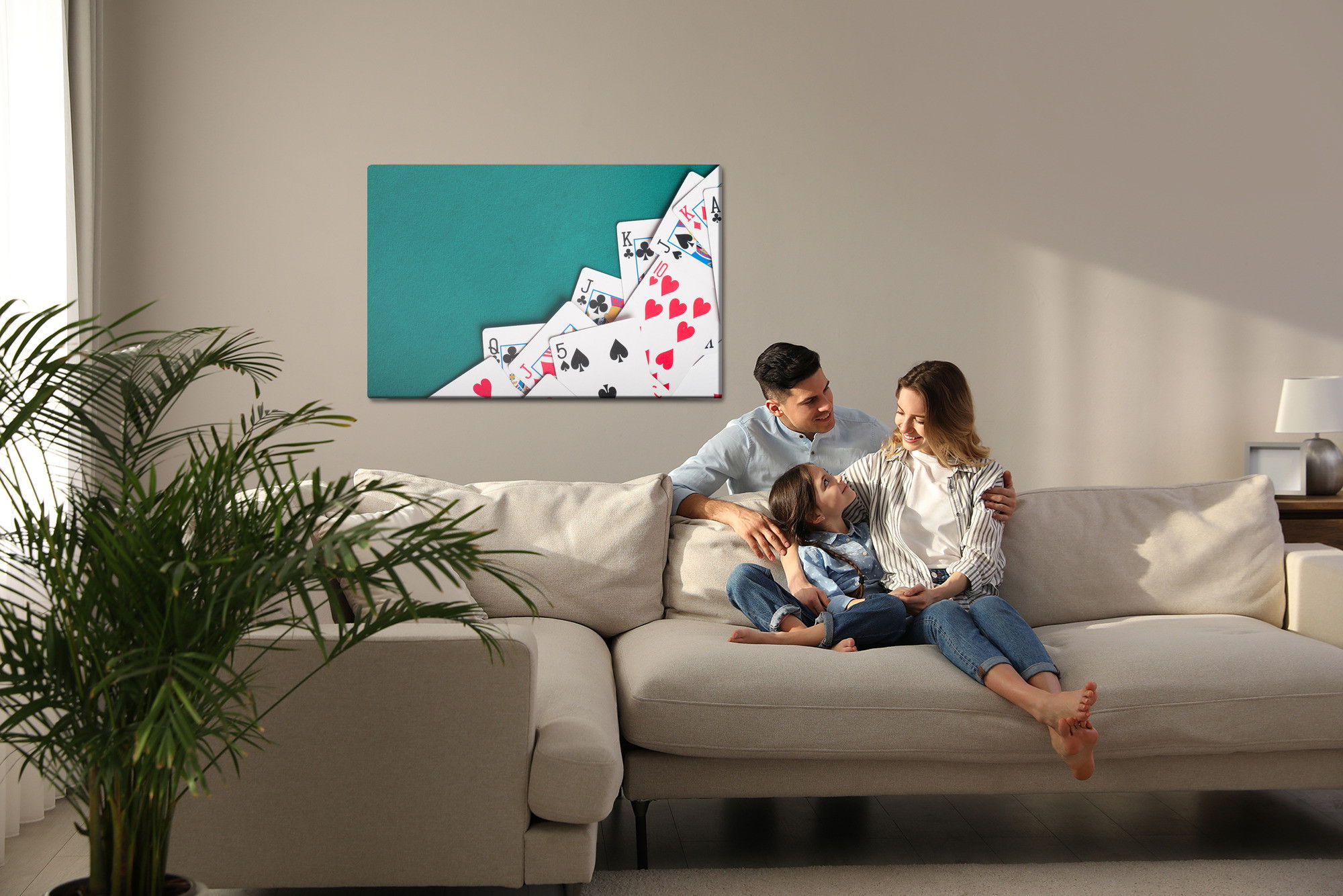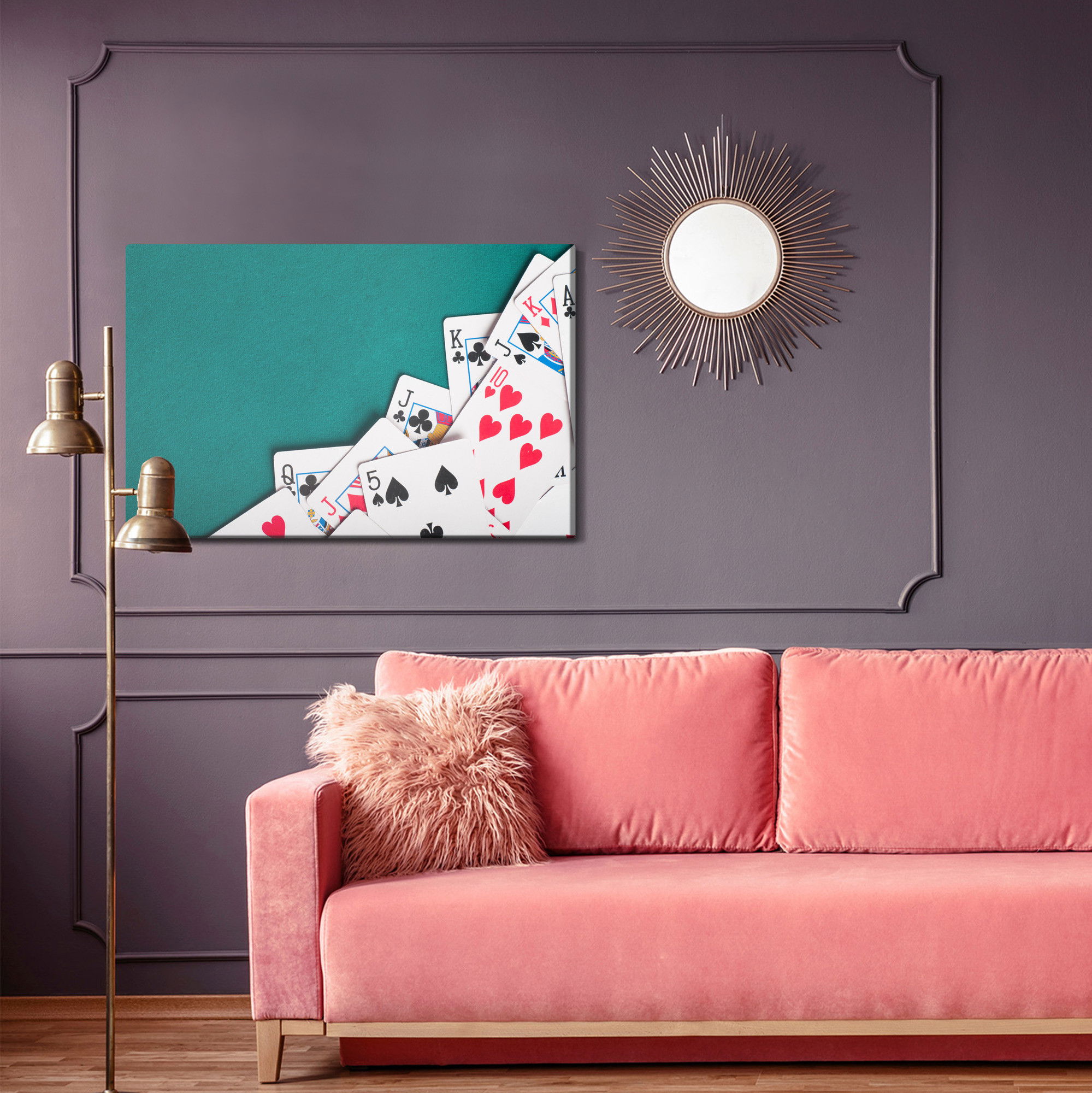Varje tavla monteras på en massiv fururam. Format upp till 70×50 cm har en ram på 15 mm, medan format från 90×60 cm och uppåt har en ram på 20 mm. Den exakta dukspänningen gör att tavlan håller sin form över tid. Motivet A scattered deck of cards trycks runt hela ramen vilket ger ett stilrent galleriuttryck där tavlan är lika vacker från sidan som framifrån. Kombinationen av rak dukspänning, rena linjer och korrekt tryck ger en professionell finish.