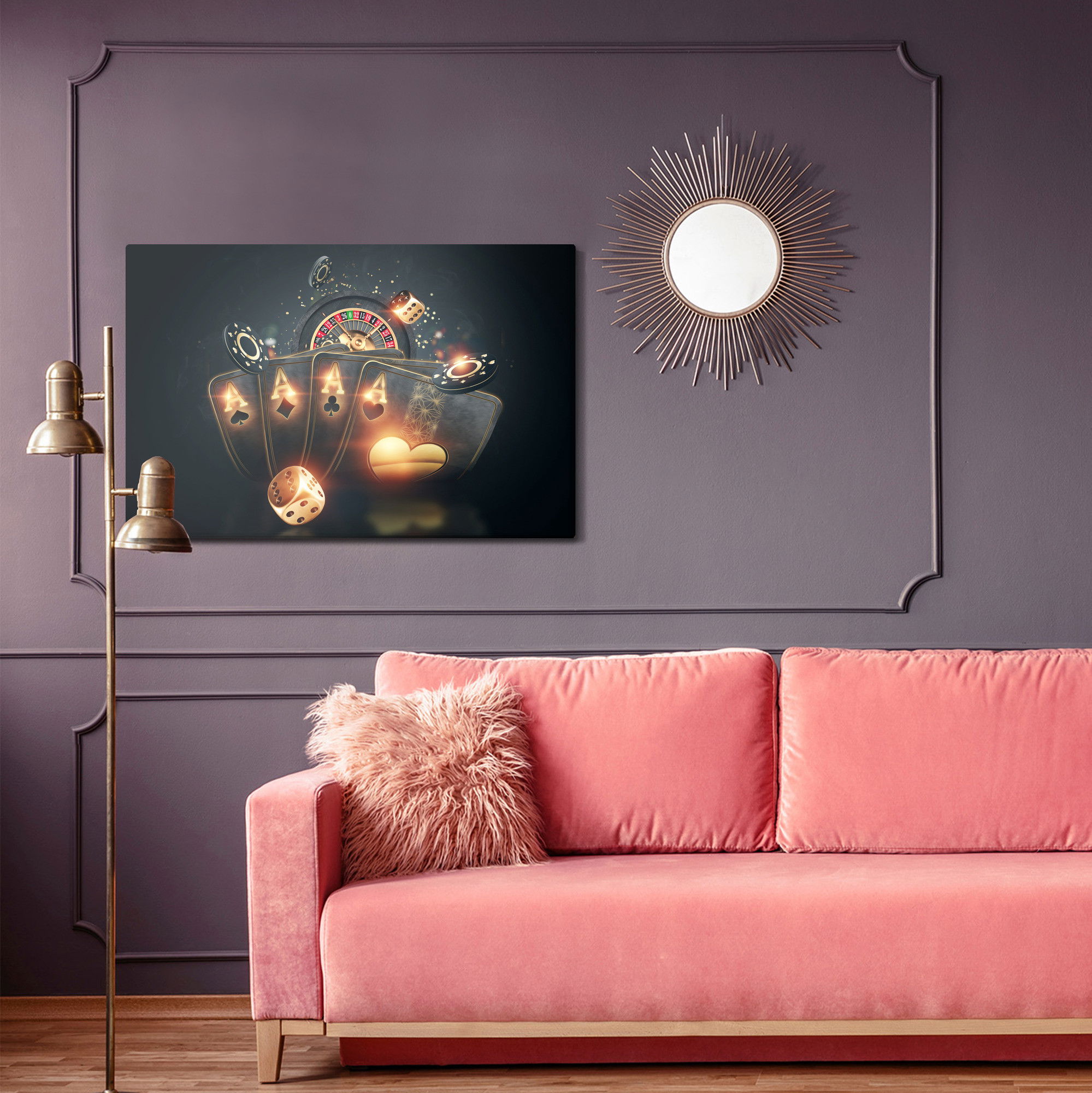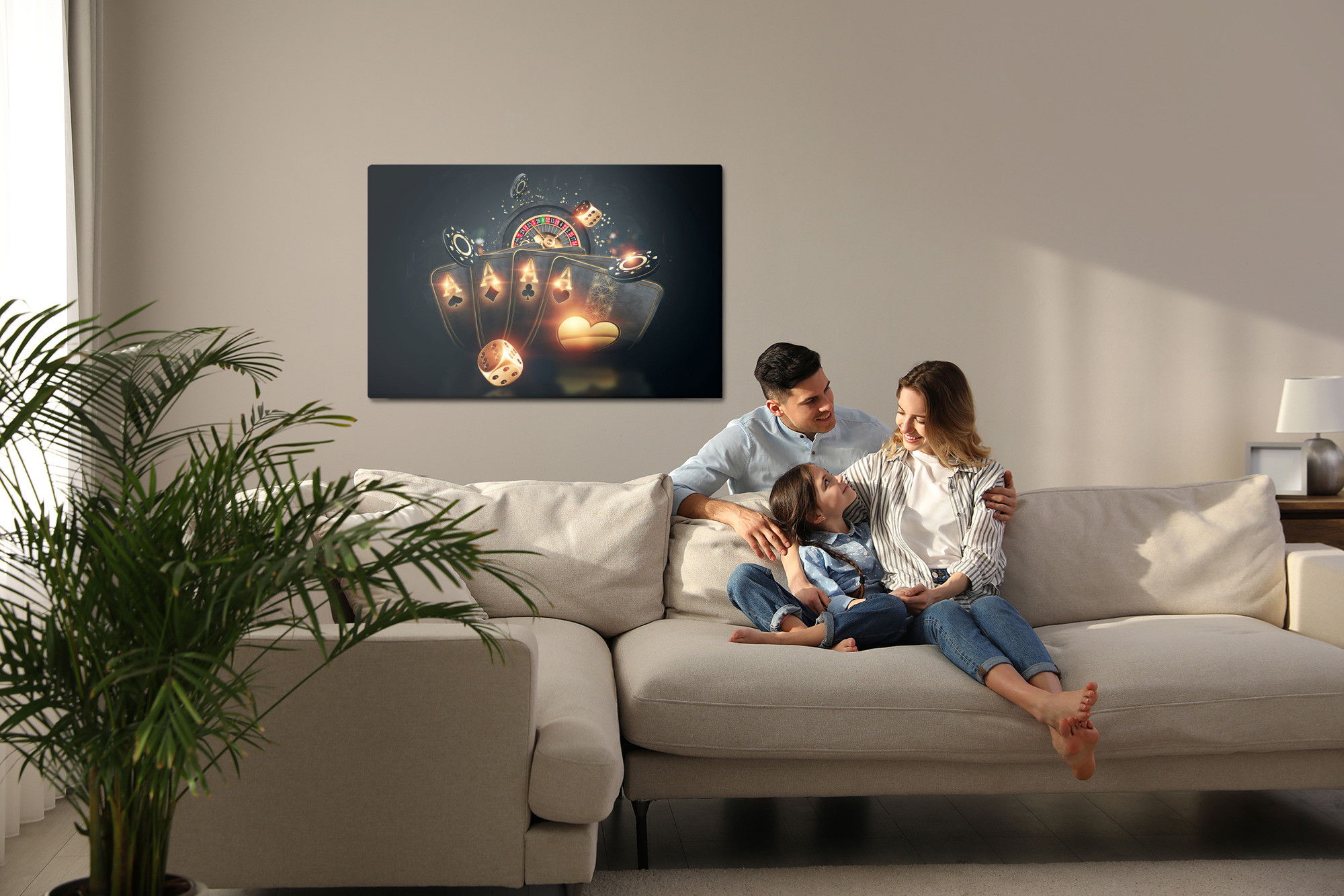 Varje tavla monteras på en massiv fururam. Format upp till 70×50 cm har en ram på 15 mm, medan format från 90×60 cm och uppåt har en ram på 20 mm. Den exakta dukspänningen gör att tavlan håller sin form över tid. Motivet Black poker cards trycks runt hela ramen vilket ger ett stilrent galleriuttryck där tavlan är lika vacker från sidan som framifrån. Kombinationen av rak dukspänning, rena linjer och korrekt tryck ger en professionell finish.
