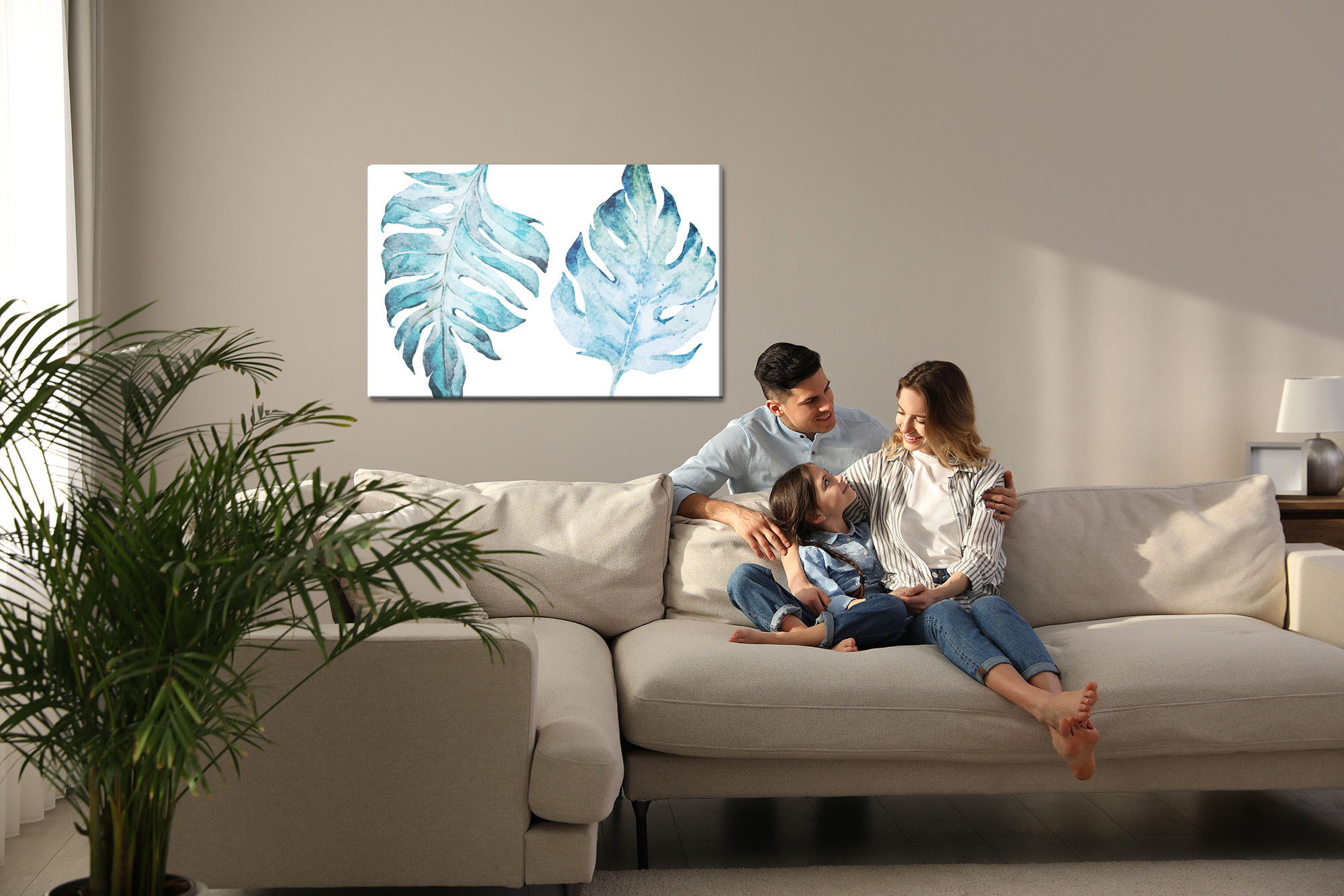 Varje tavla monteras på en massiv fururam. Format upp till 70×50 cm har en ram på 15 mm, medan format från 90×60 cm och uppåt har en ram på 20 mm. Den exakta dukspänningen gör att tavlan håller sin form över tid. Motivet Blue monstera leaves painted trycks runt hela ramen vilket ger ett stilrent galleriuttryck där tavlan är lika vacker från sidan som framifrån. Kombinationen av rak dukspänning, rena linjer och korrekt tryck ger en professionell finish.