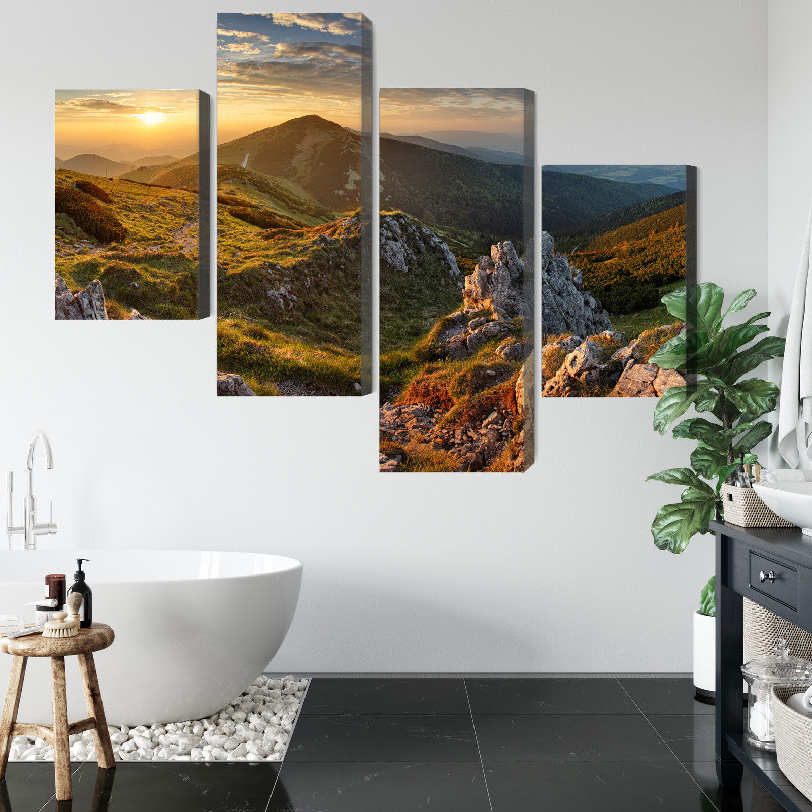 Placera tavlan där du upplever mycket eko eller hög ljudnivå, till exempel i öppna planlösningar, hemmakontor eller sociala ytor. Motiv i denna kategori gör sig särskilt bra i rum där du vill skapa en genomtänkt och sammanhängande känsla. Landskap och naturmotiv tillför en organisk mjukhet där färger och former skapar ett harmoniskt intryck som fungerar i både ljusa och mer dämpade interiörer.