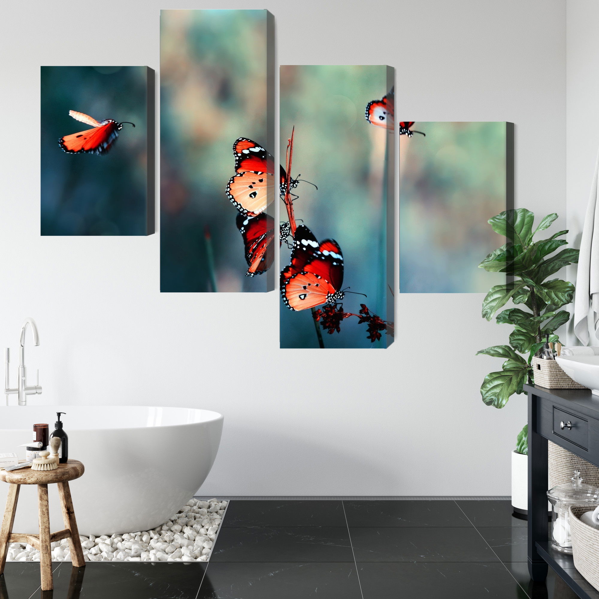 Motivet Colorful butterflies återges med hög färgprecision och detaljrikedom tack vare HP Latex-teknologi. Trycket sker med vattenbaserade, luktfria och GREENGUARD Gold-certifierade bläck som ger en upplösning på upp till 300 DPI. Färgerna är UV-beständiga och behåller sin styrka även i ljusa rum, vilket gör tavlan lämplig för både hem- och offentliga miljöer.