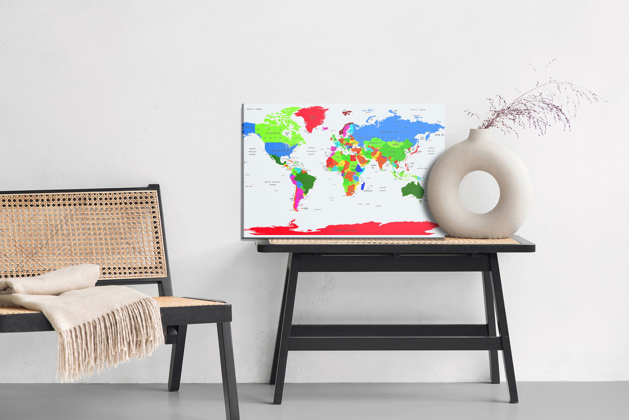 Varje tavla monteras på en massiv fururam. Format upp till 70×50 cm har en ram på 15 mm, medan format från 90×60 cm och uppåt har en ram på 20 mm. Den exakta dukspänningen gör att tavlan håller sin form över tid. Motivet Colorful world political map trycks runt hela ramen vilket ger ett stilrent galleriuttryck där tavlan är lika vacker från sidan som framifrån. Kombinationen av rak dukspänning, rena linjer och korrekt tryck ger en professionell finish.