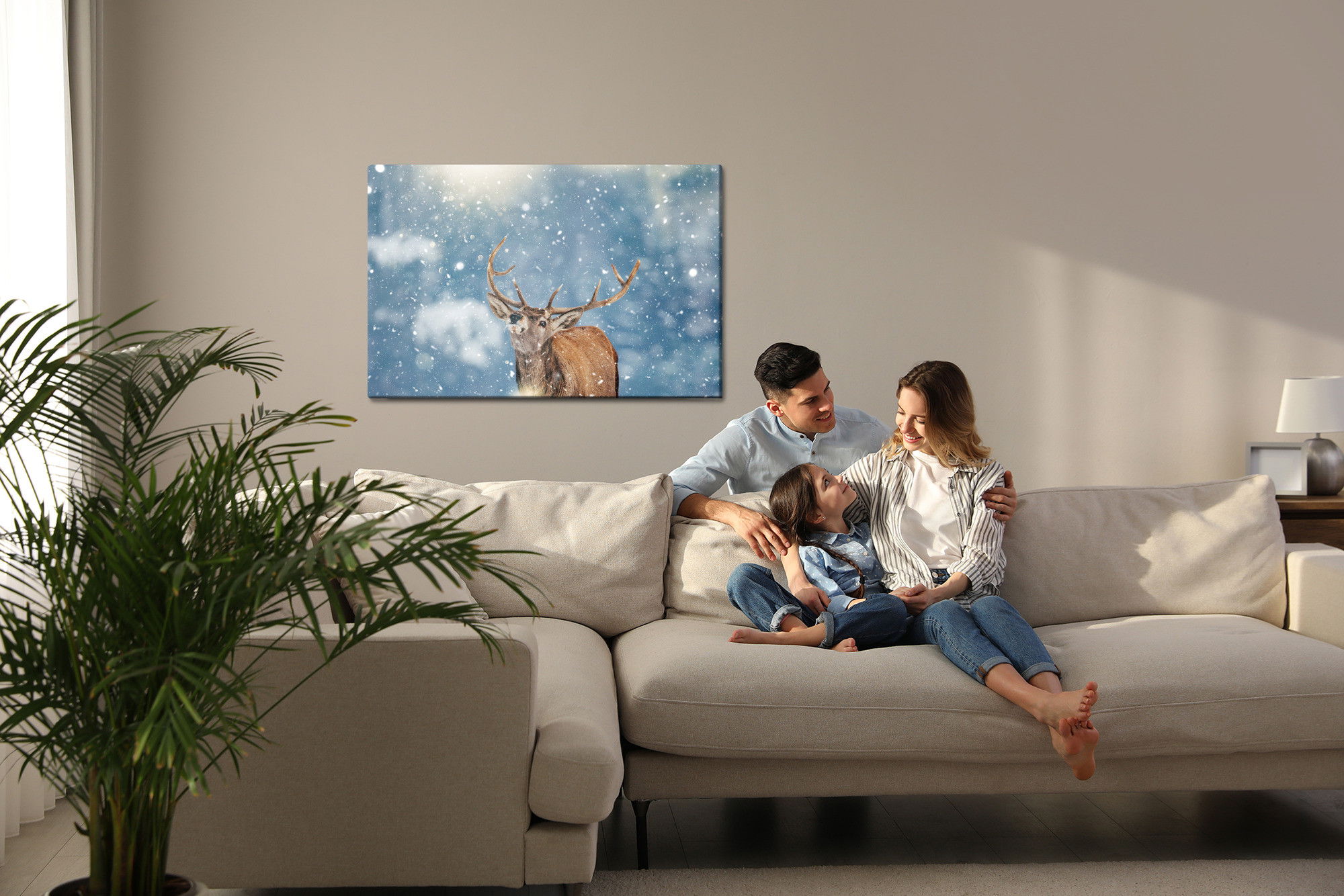 Motivet Deer and snowflakes återges med hög färgprecision och detaljrikedom tack vare HP Latex-teknologi. Trycket sker med vattenbaserade, luktfria och GREENGUARD Gold-certifierade bläck som ger en upplösning på upp till 300 DPI. Färgerna är UV-beständiga och behåller sin styrka även i ljusa rum, vilket gör tavlan lämplig för både hem- och offentliga miljöer.
