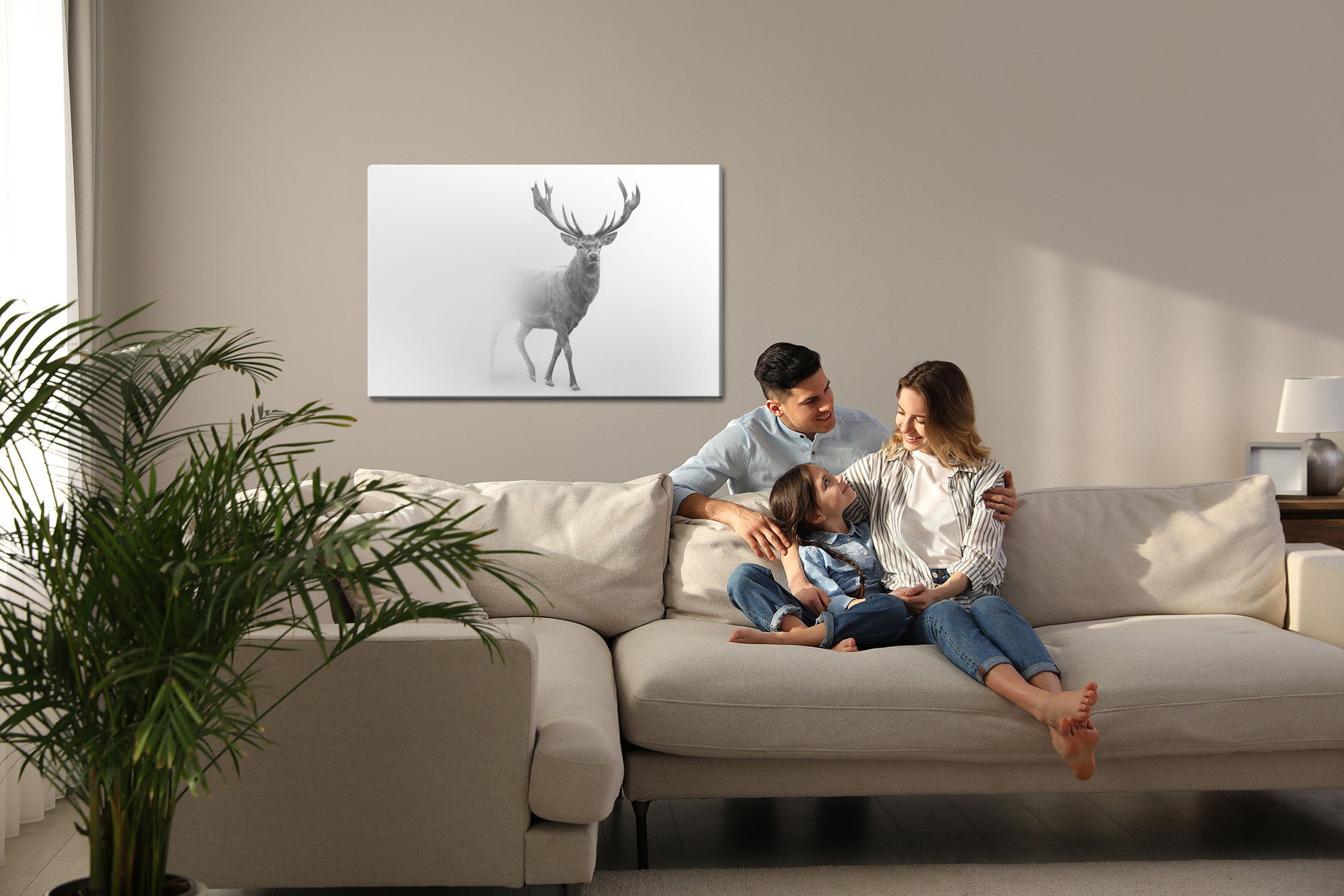 Varje tavla monteras på en massiv fururam. Format upp till 70×50 cm har en ram på 15 mm, medan format från 90×60 cm och uppåt har en ram på 20 mm. Den exakta dukspänningen gör att tavlan håller sin form över tid. Motivet Deer in black and white trycks runt hela ramen vilket ger ett stilrent galleriuttryck där tavlan är lika vacker från sidan som framifrån. Kombinationen av rak dukspänning, rena linjer och korrekt tryck ger en professionell finish.