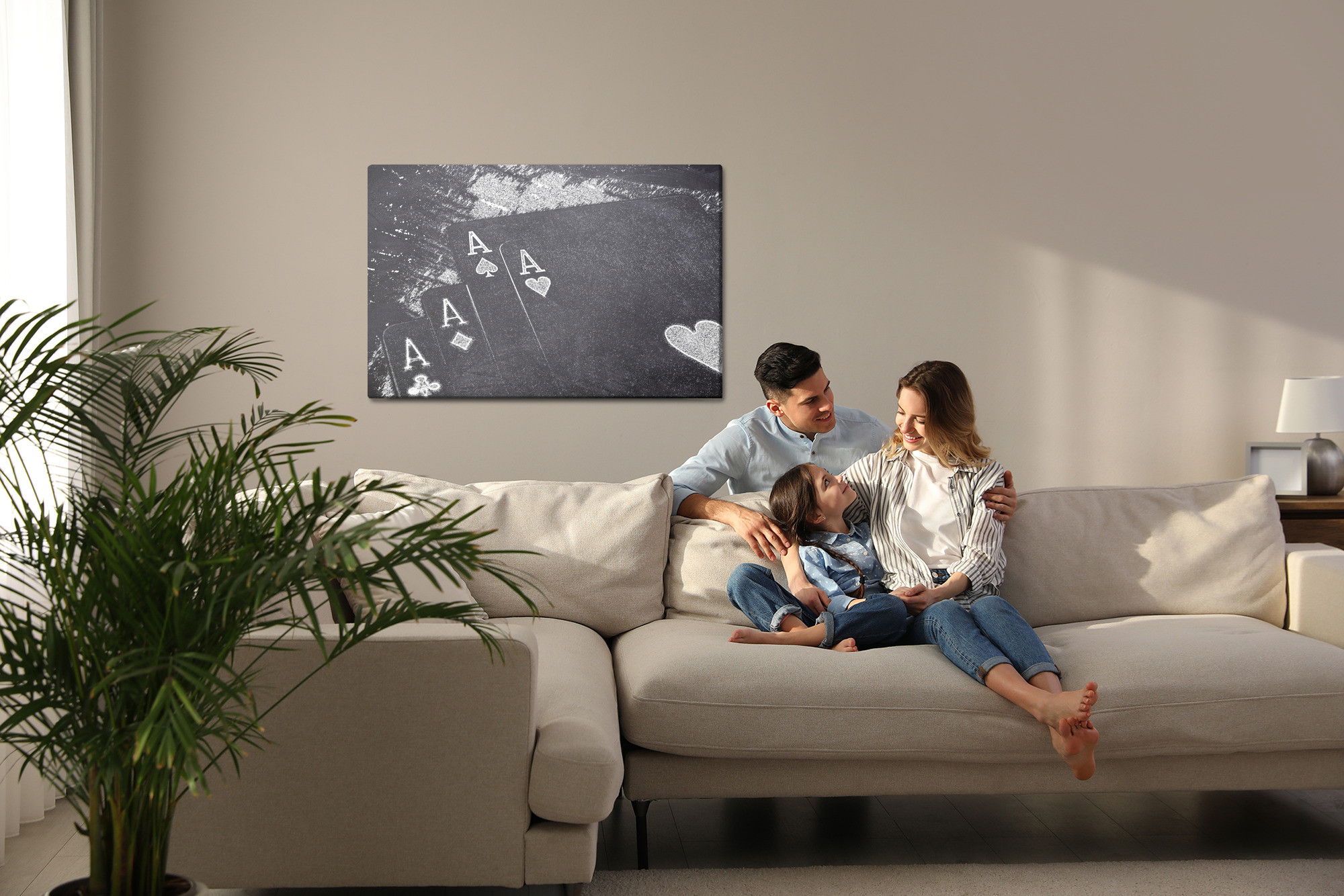 Varje tavla monteras på en massiv fururam. Format upp till 70×50 cm har en ram på 15 mm, medan format från 90×60 cm och uppåt har en ram på 20 mm. Den exakta dukspänningen gör att tavlan håller sin form över tid. Motivet Drawn playing cards trycks runt hela ramen vilket ger ett stilrent galleriuttryck där tavlan är lika vacker från sidan som framifrån. Kombinationen av rak dukspänning, rena linjer och korrekt tryck ger en professionell finish.