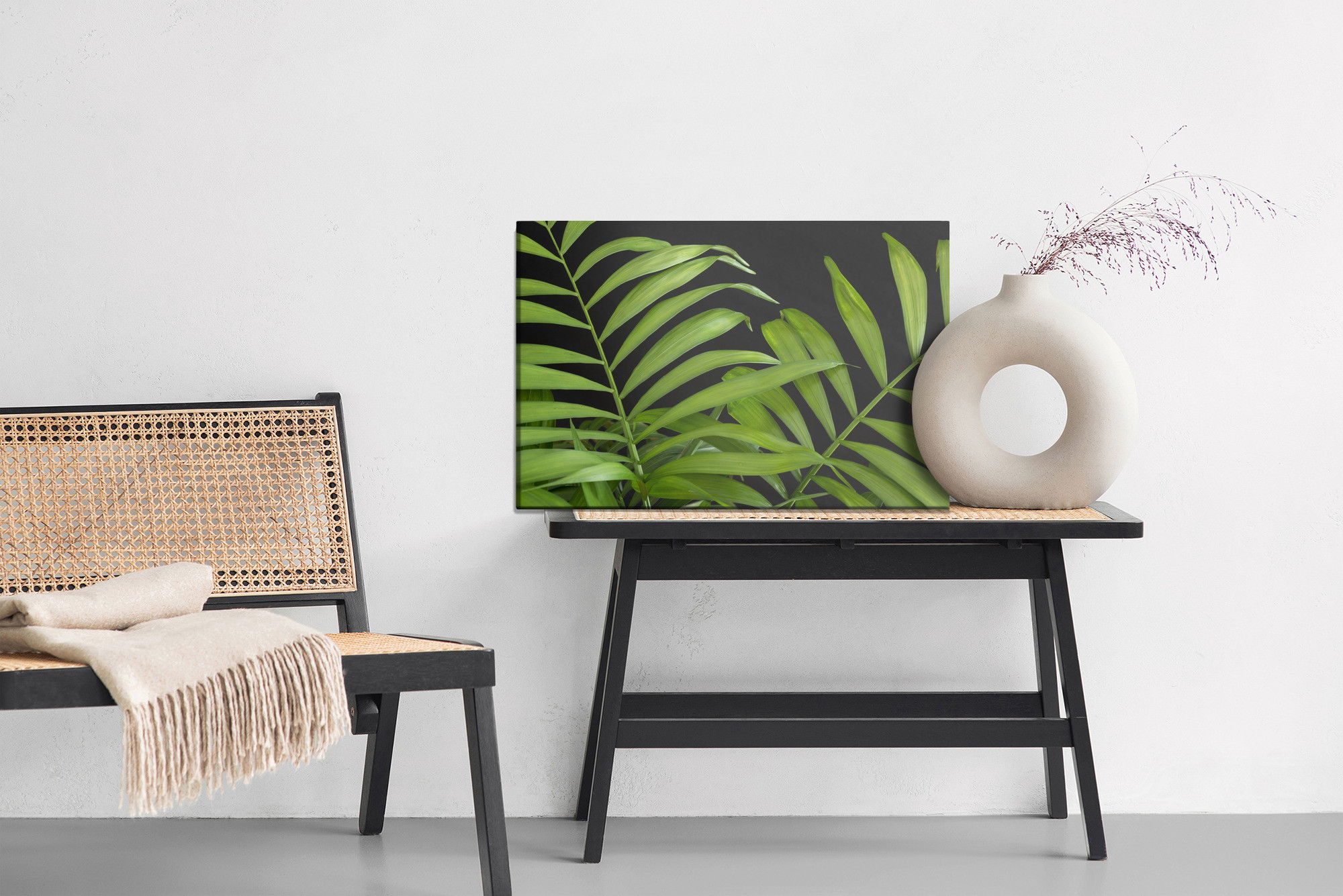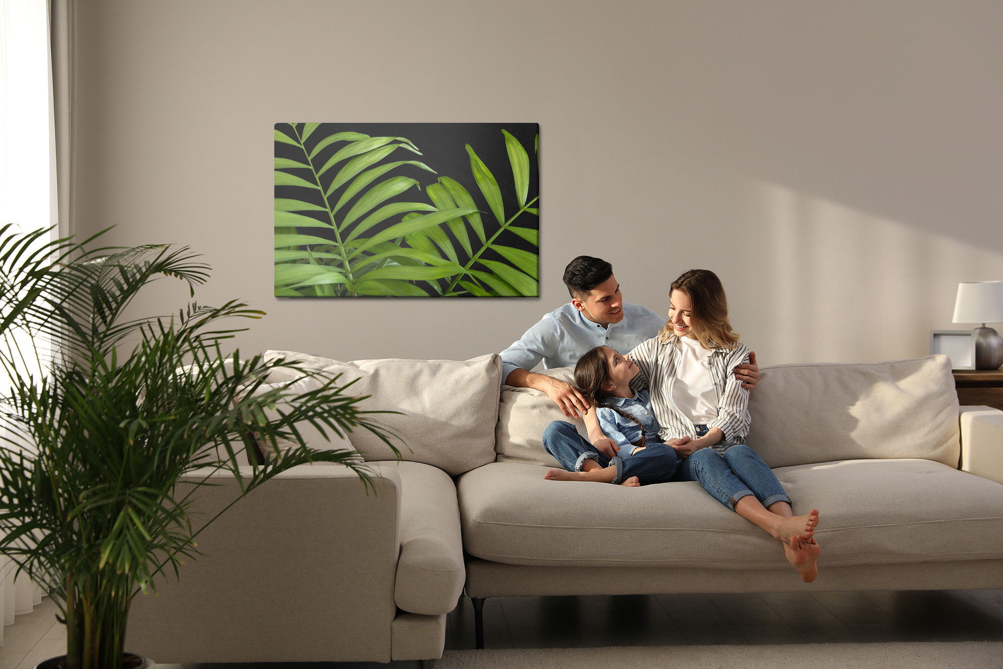 Varje tavla monteras på en massiv fururam. Format upp till 70×50 cm har en ram på 15 mm, medan format från 90×60 cm och uppåt har en ram på 20 mm. Den exakta dukspänningen gör att tavlan håller sin form över tid. Motivet Green tropical leaves trycks runt hela ramen vilket ger ett stilrent galleriuttryck där tavlan är lika vacker från sidan som framifrån. Kombinationen av rak dukspänning, rena linjer och korrekt tryck ger en professionell finish.