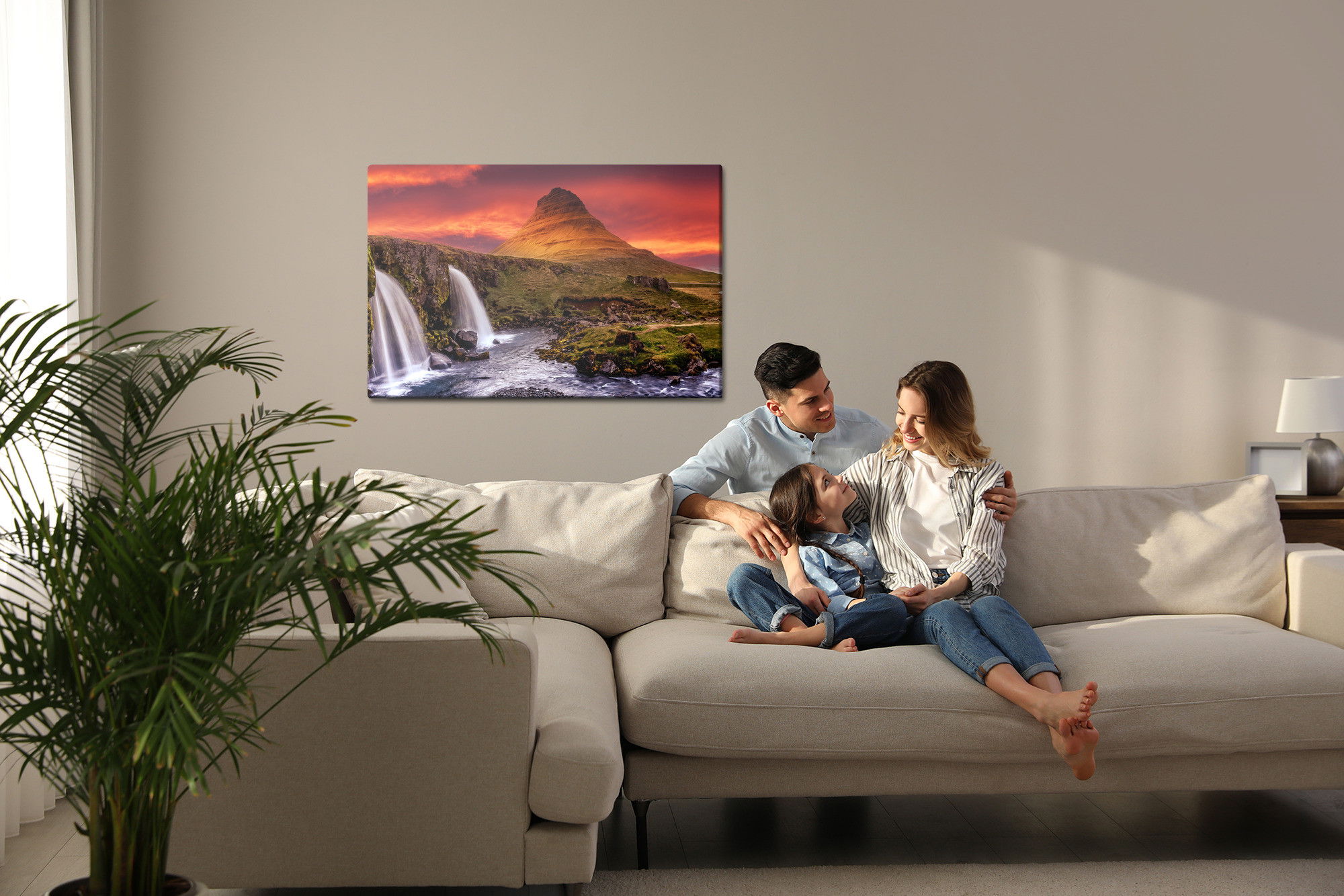Varje tavla monteras på en massiv fururam. Format upp till 70×50 cm har en ram på 15 mm, medan format från 90×60 cm och uppåt har en ram på 20 mm. Den exakta dukspänningen gör att tavlan håller sin form över tid. Motivet Kirkjufellsfoss waterfall trycks runt hela ramen vilket ger ett stilrent galleriuttryck där tavlan är lika vacker från sidan som framifrån. Kombinationen av rak dukspänning, rena linjer och korrekt tryck ger en professionell finish.