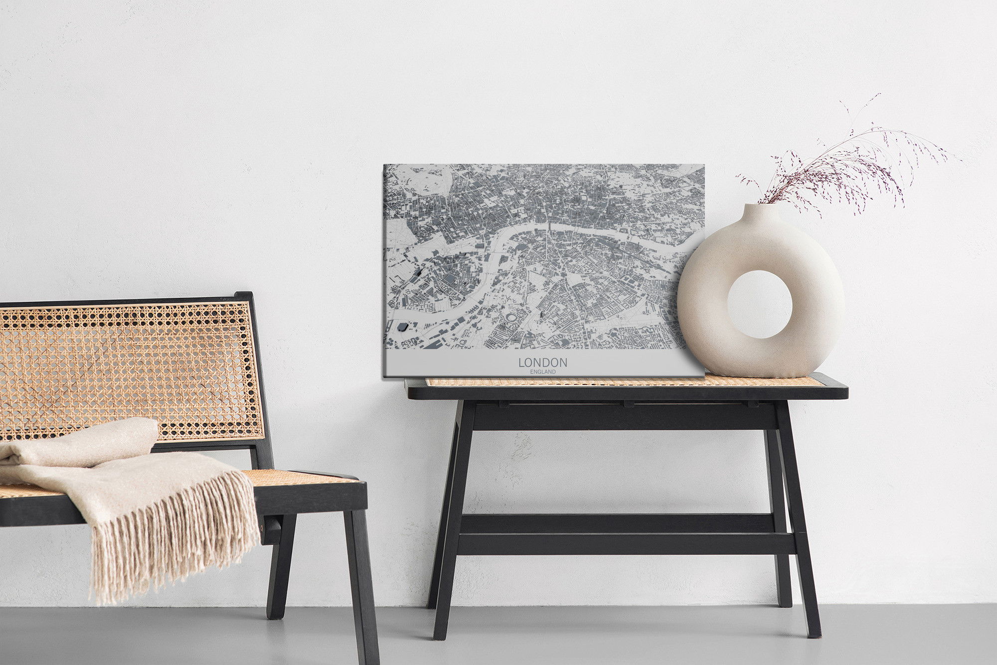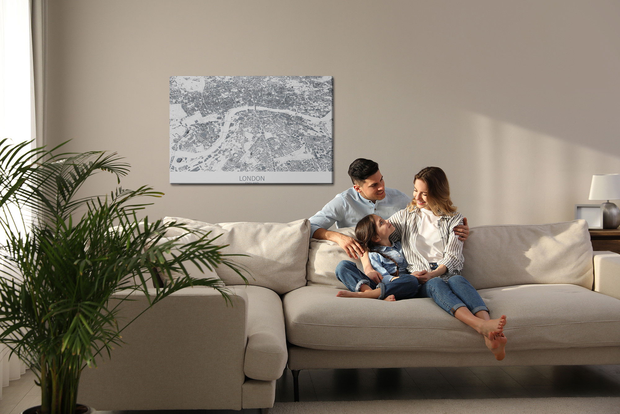 Varje tavla monteras på en massiv fururam. Format upp till 70×50 cm har en ram på 15 mm, medan format från 90×60 cm och uppåt har en ram på 20 mm. Den exakta dukspänningen gör att tavlan håller sin form över tid. Motivet London’s map trycks runt hela ramen vilket ger ett stilrent galleriuttryck där tavlan är lika vacker från sidan som framifrån. Kombinationen av rak dukspänning, rena linjer och korrekt tryck ger en professionell finish.