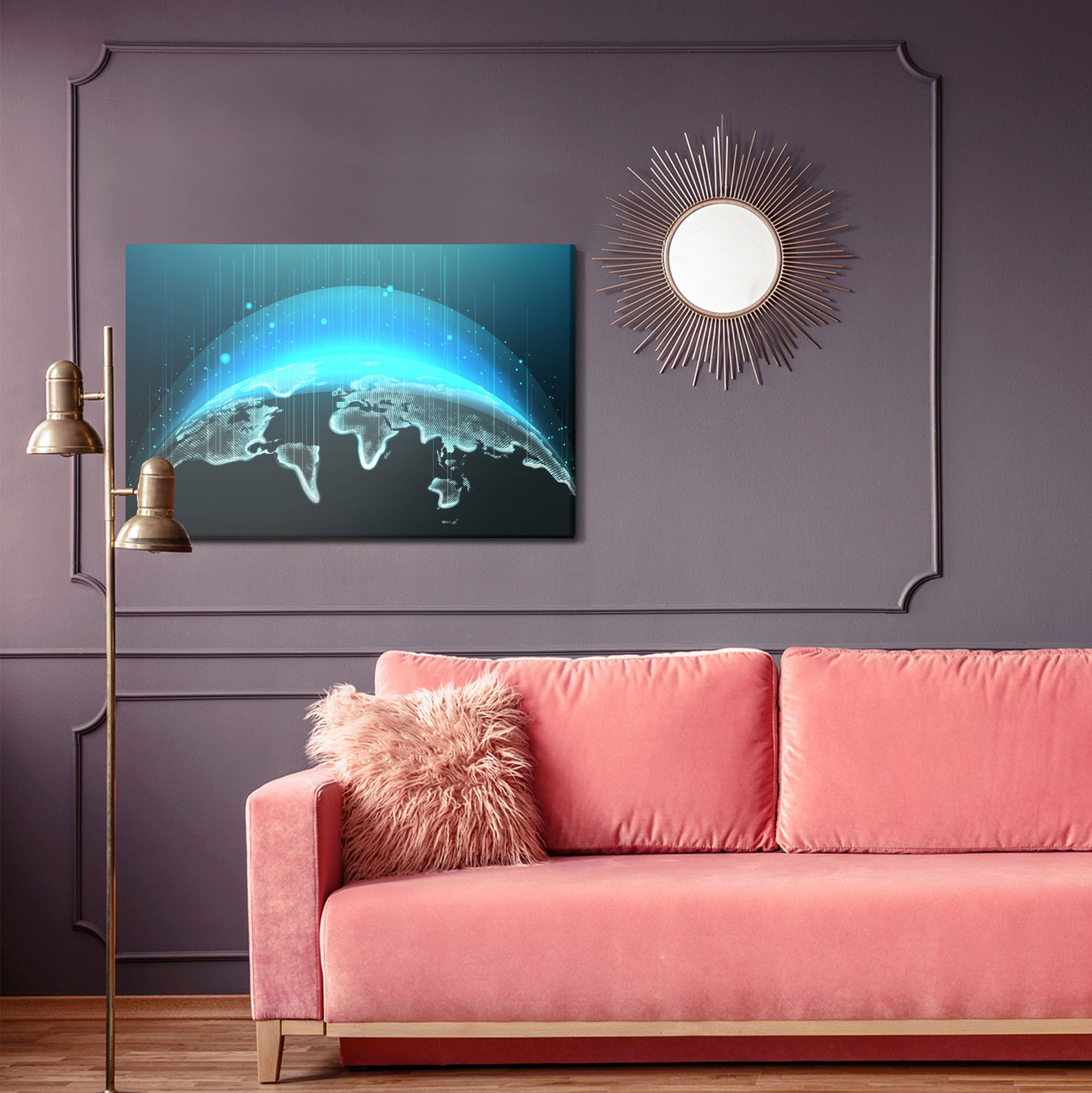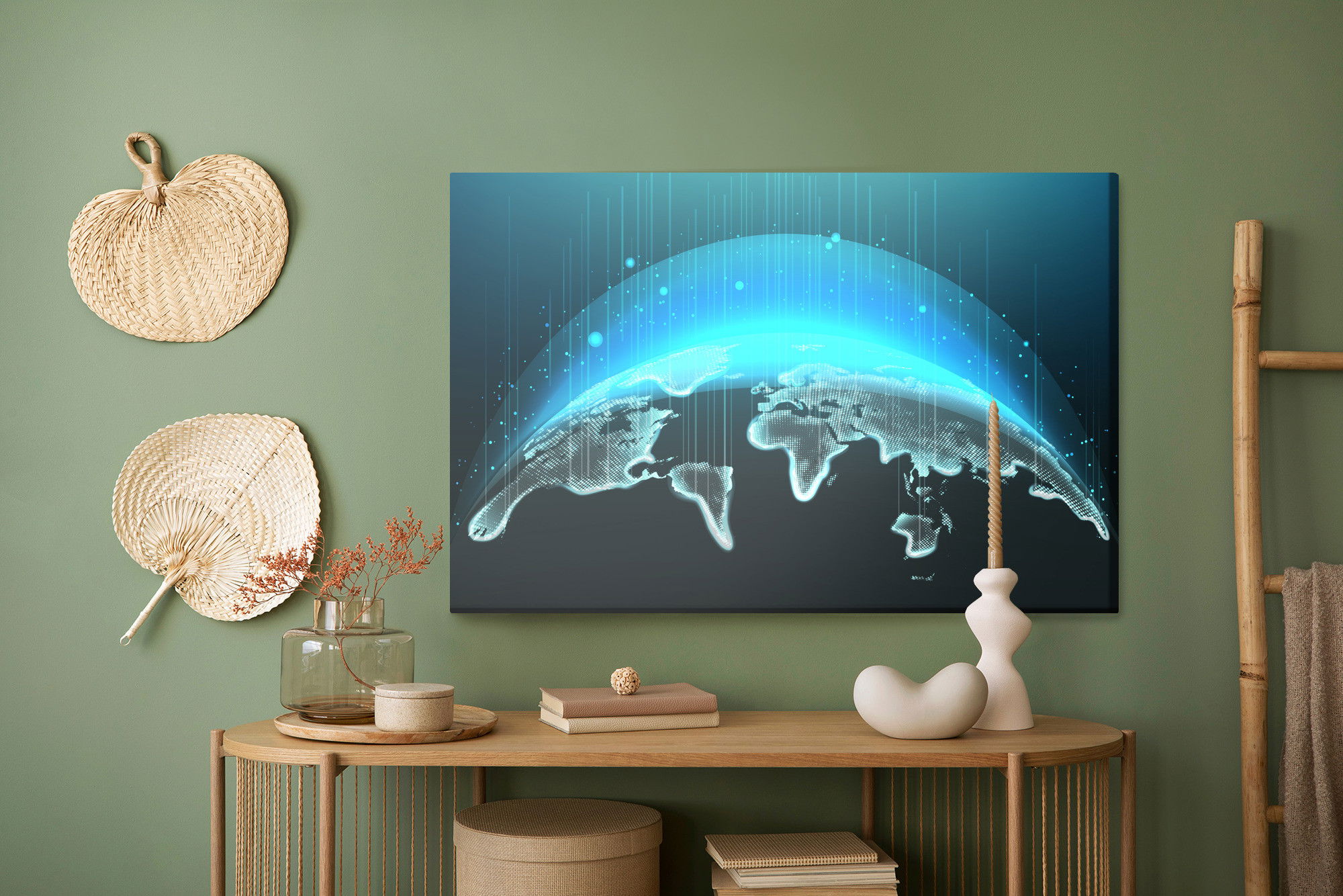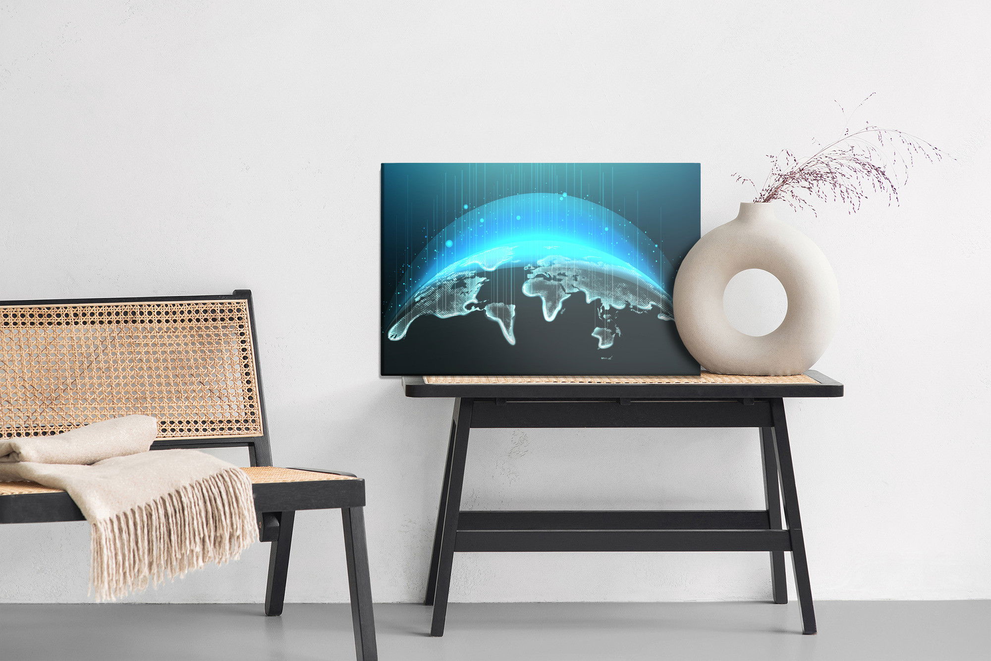 Motivet Modernist 3d world map återges med hög färgprecision och detaljrikedom tack vare HP Latex-teknologi. Trycket sker med vattenbaserade, luktfria och GREENGUARD Gold-certifierade bläck som ger en upplösning på upp till 300 DPI. Färgerna är UV-beständiga och behåller sin styrka även i ljusa rum, vilket gör tavlan lämplig för både hem- och offentliga miljöer.