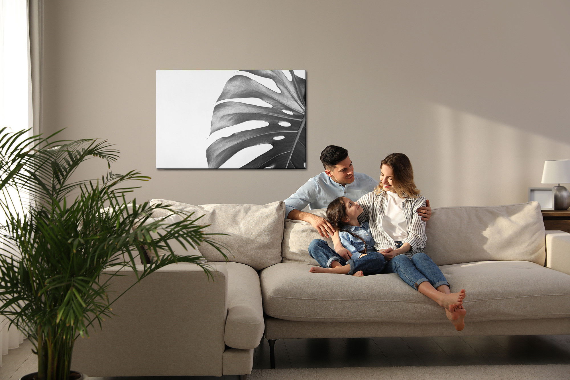 Varje tavla monteras på en massiv fururam. Format upp till 70×50 cm har en ram på 15 mm, medan format från 90×60 cm och uppåt har en ram på 20 mm. Den exakta dukspänningen gör att tavlan håller sin form över tid. Motivet Monstera leaf in black trycks runt hela ramen vilket ger ett stilrent galleriuttryck där tavlan är lika vacker från sidan som framifrån. Kombinationen av rak dukspänning, rena linjer och korrekt tryck ger en professionell finish.