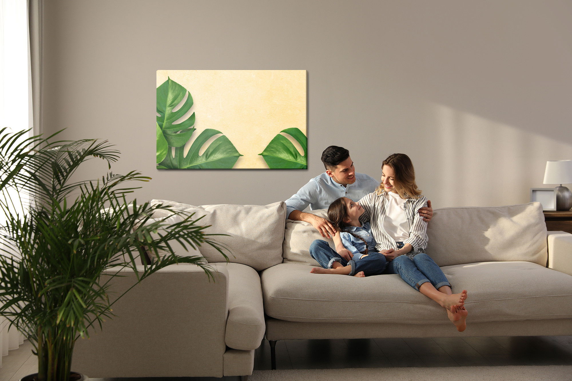 Motivet Monstera leaves on a beige återges med hög färgprecision och detaljrikedom tack vare HP Latex-teknologi. Trycket sker med vattenbaserade, luktfria och GREENGUARD Gold-certifierade bläck som ger en upplösning på upp till 300 DPI. Färgerna är UV-beständiga och behåller sin styrka även i ljusa rum, vilket gör tavlan lämplig för både hem- och offentliga miljöer.