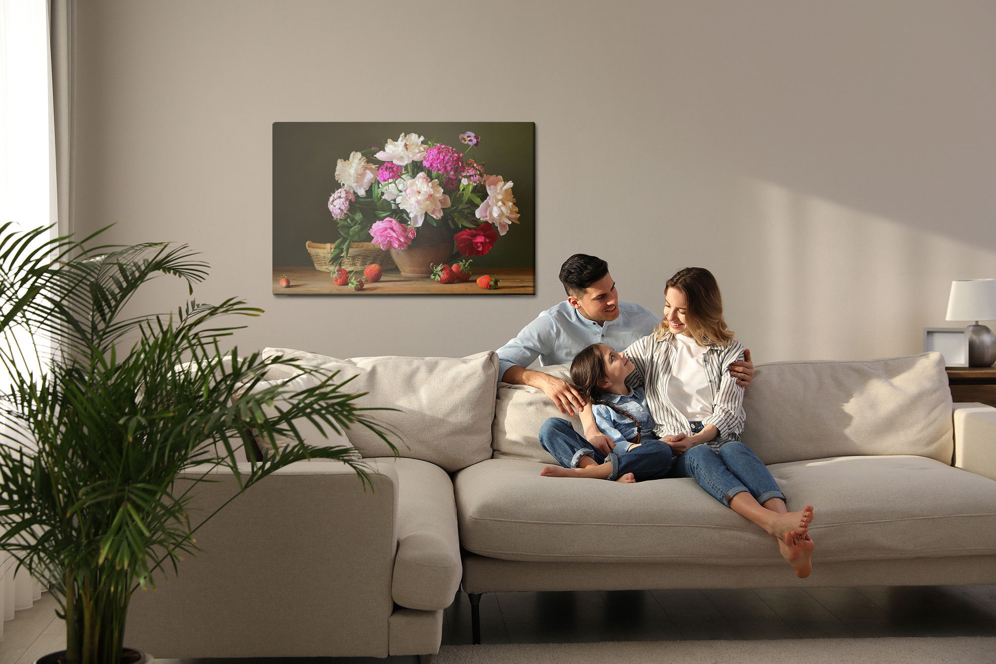 Varje tavla monteras på en massiv fururam. Format upp till 70×50 cm har en ram på 15 mm, medan format från 90×60 cm och uppåt har en ram på 20 mm. Den exakta dukspänningen gör att tavlan håller sin form över tid. Motivet Peonies with strawberries trycks runt hela ramen vilket ger ett stilrent galleriuttryck där tavlan är lika vacker från sidan som framifrån. Kombinationen av rak dukspänning, rena linjer och korrekt tryck ger en professionell finish.