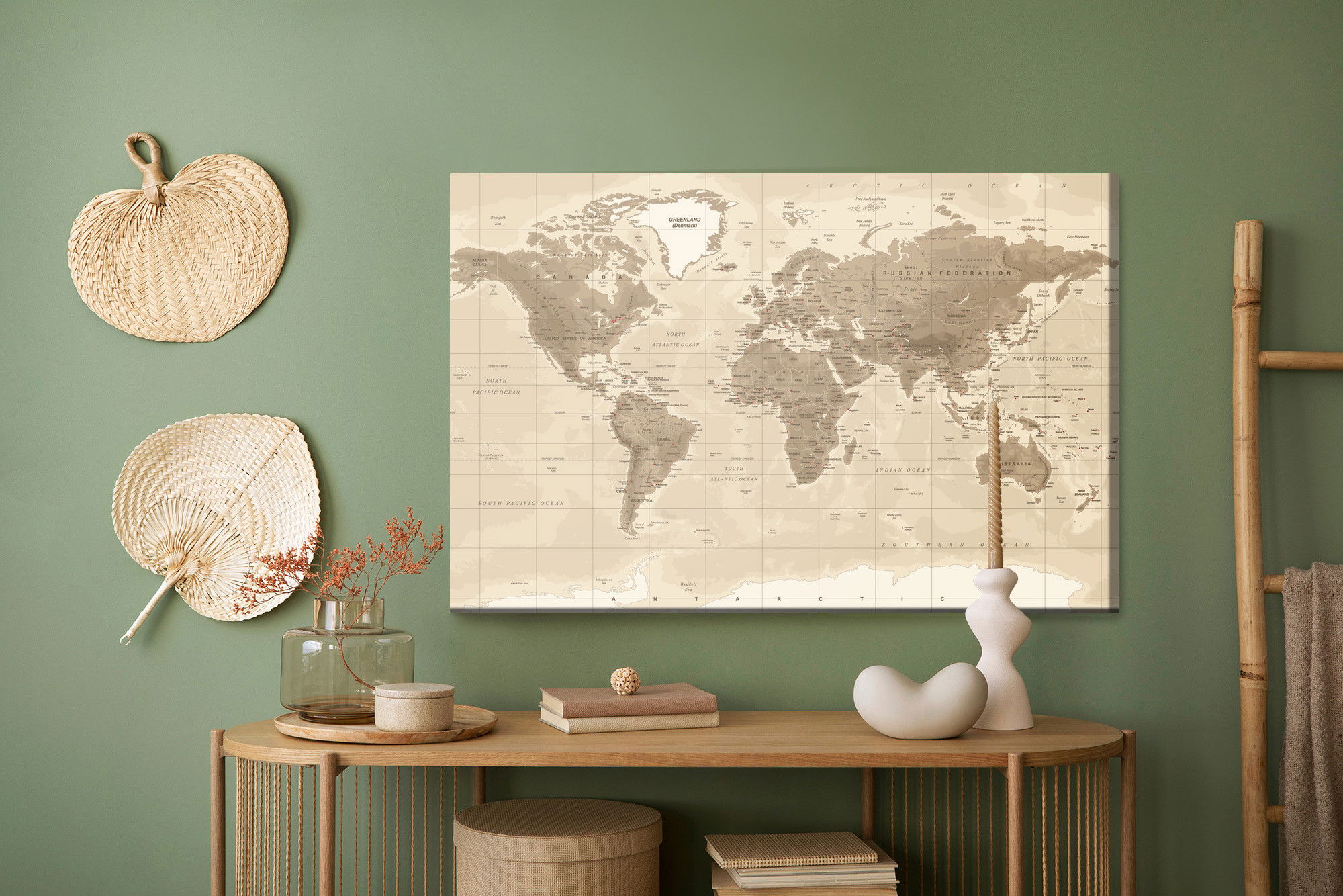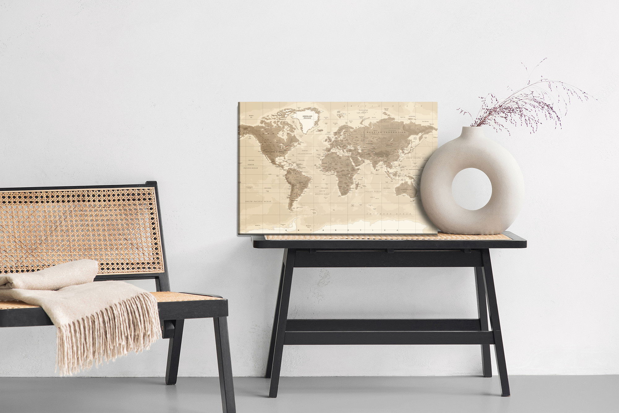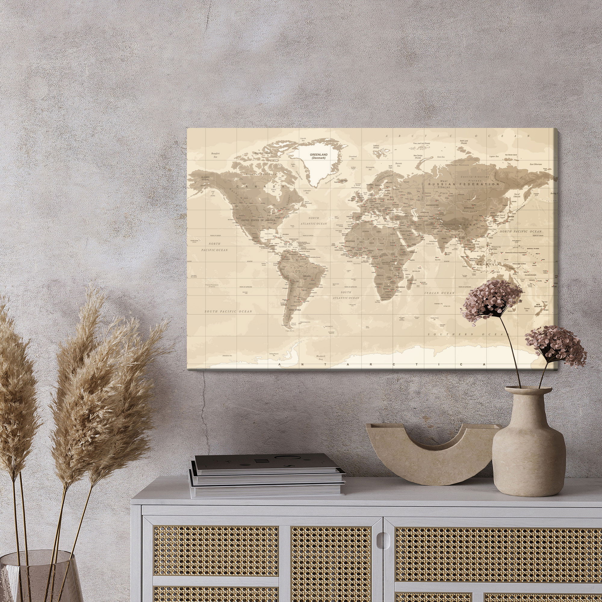 Varje tavla monteras på en massiv fururam. Format upp till 70×50 cm har en ram på 15 mm, medan format från 90×60 cm och uppåt har en ram på 20 mm. Den exakta dukspänningen gör att tavlan håller sin form över tid. Motivet Physical world map trycks runt hela ramen vilket ger ett stilrent galleriuttryck där tavlan är lika vacker från sidan som framifrån. Kombinationen av rak dukspänning, rena linjer och korrekt tryck ger en professionell finish.