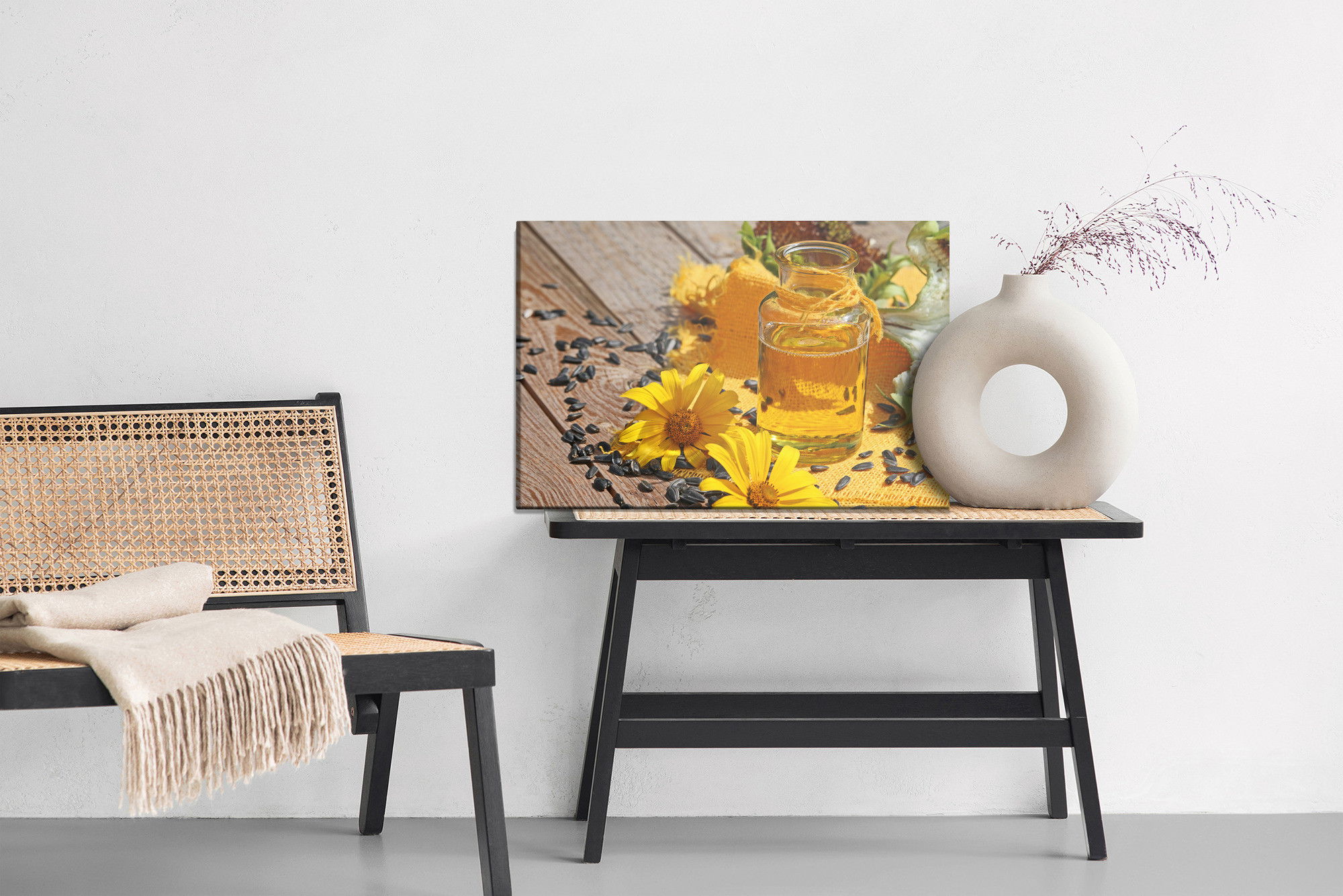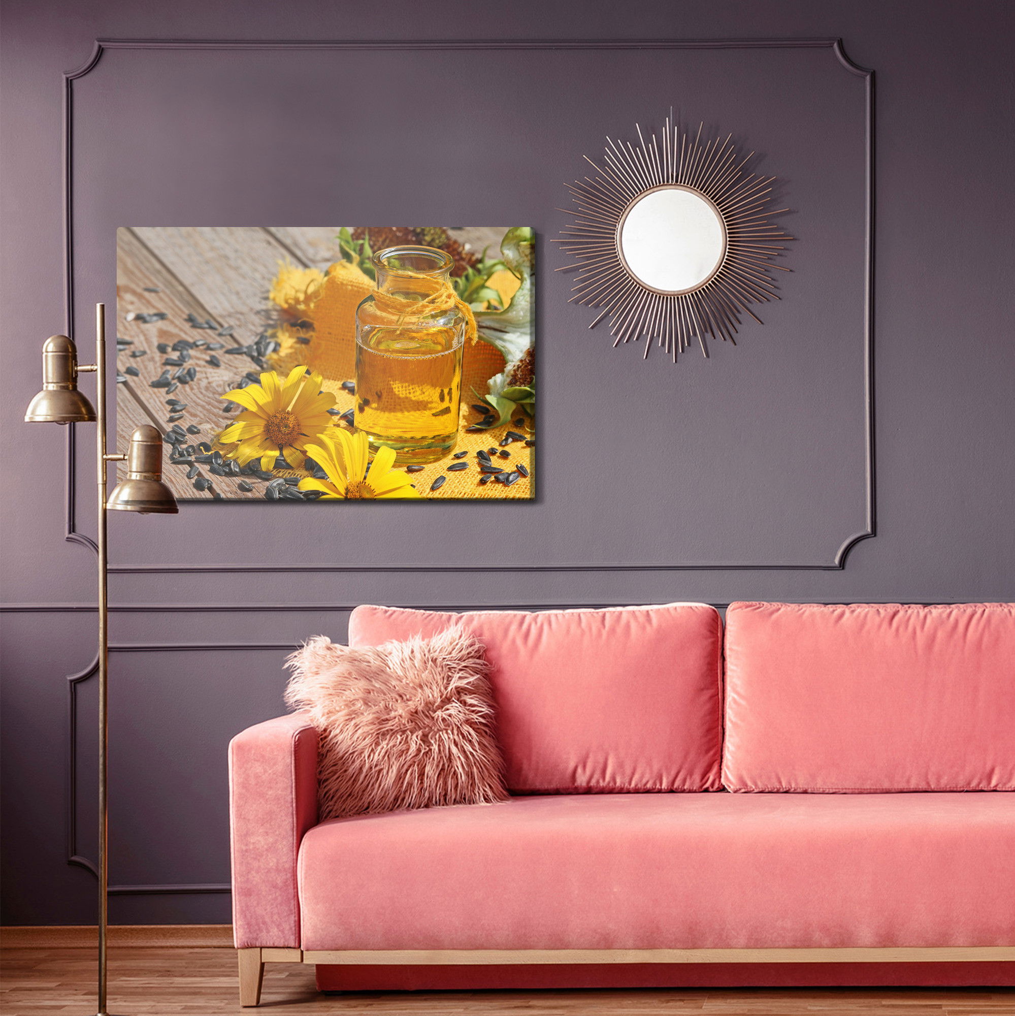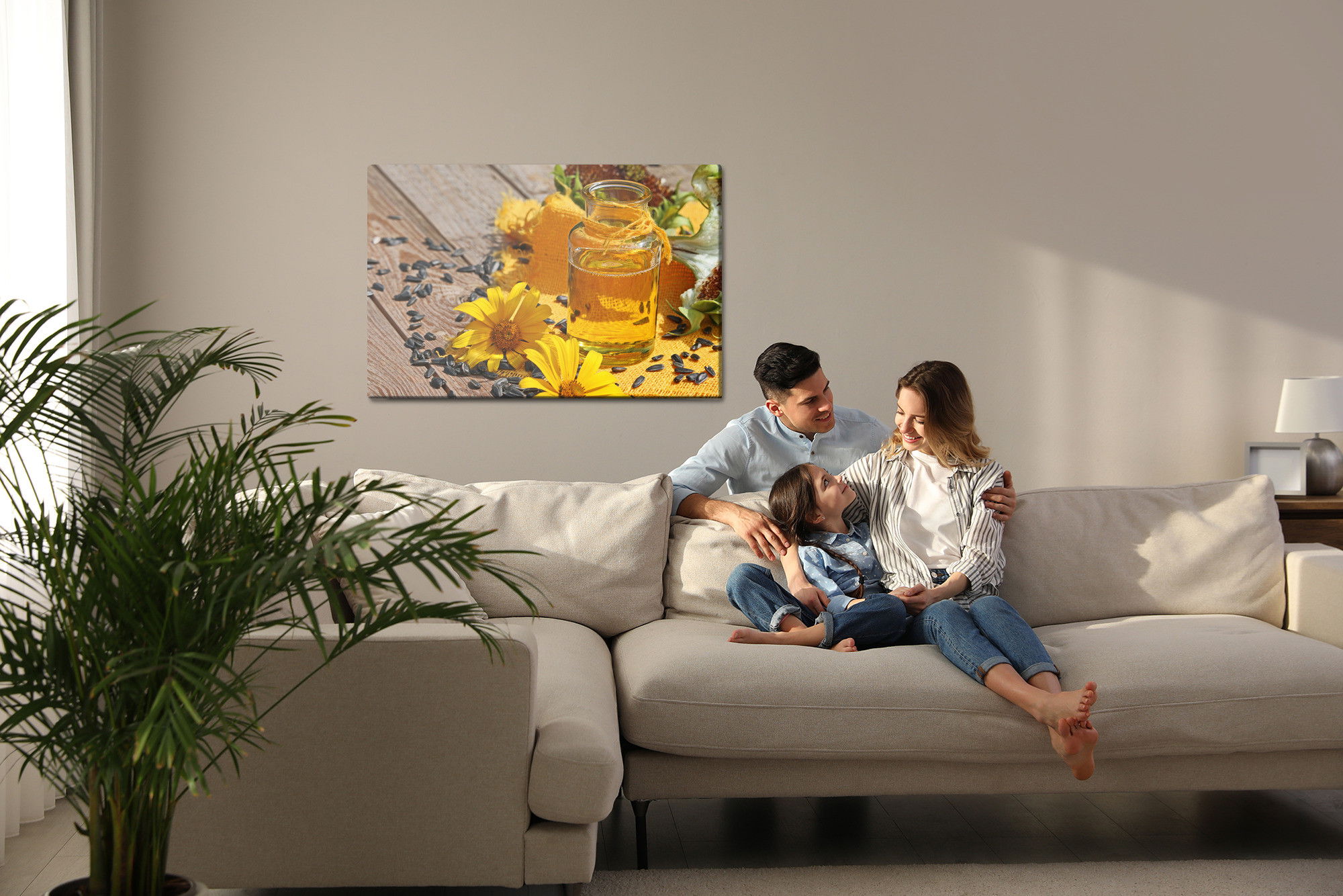 Motivet Sunflower oil with flowers återges med hög färgprecision och detaljrikedom tack vare HP Latex-teknologi. Trycket sker med vattenbaserade, luktfria och GREENGUARD Gold-certifierade bläck som ger en upplösning på upp till 300 DPI. Färgerna är UV-beständiga och behåller sin styrka även i ljusa rum, vilket gör tavlan lämplig för både hem- och offentliga miljöer.