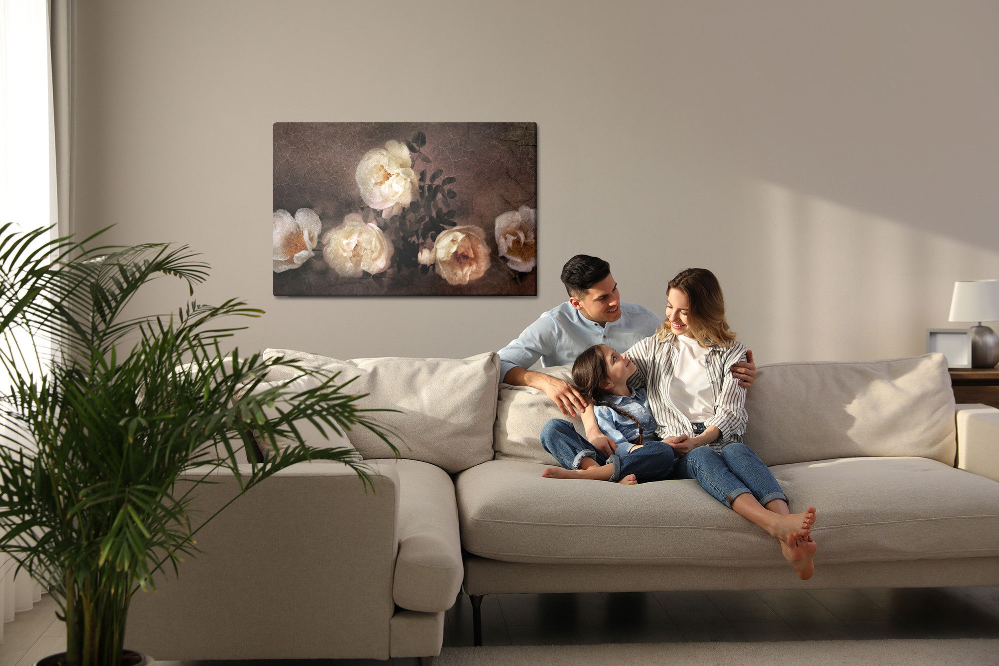 Varje tavla monteras på en massiv fururam. Format upp till 70×50 cm har en ram på 15 mm, medan format från 90×60 cm och uppåt har en ram på 20 mm. Den exakta dukspänningen gör att tavlan håller sin form över tid. Motivet Vintage wild roses trycks runt hela ramen vilket ger ett stilrent galleriuttryck där tavlan är lika vacker från sidan som framifrån. Kombinationen av rak dukspänning, rena linjer och korrekt tryck ger en professionell finish.