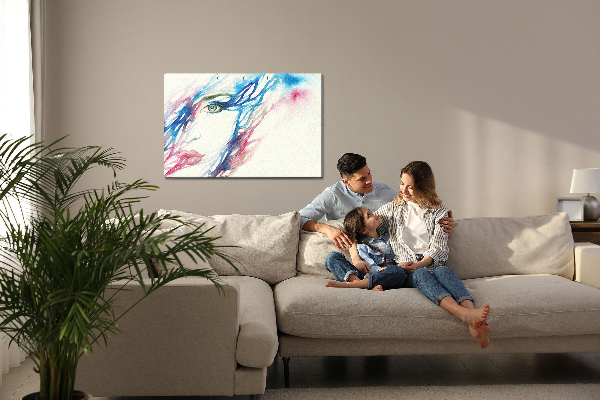 Motivet Watercolor woman face återges med hög färgprecision och detaljrikedom tack vare HP Latex-teknologi. Trycket sker med vattenbaserade, luktfria och GREENGUARD Gold-certifierade bläck som ger en upplösning på upp till 300 DPI. Färgerna är UV-beständiga och behåller sin styrka även i ljusa rum, vilket gör tavlan lämplig för både hem- och offentliga miljöer.