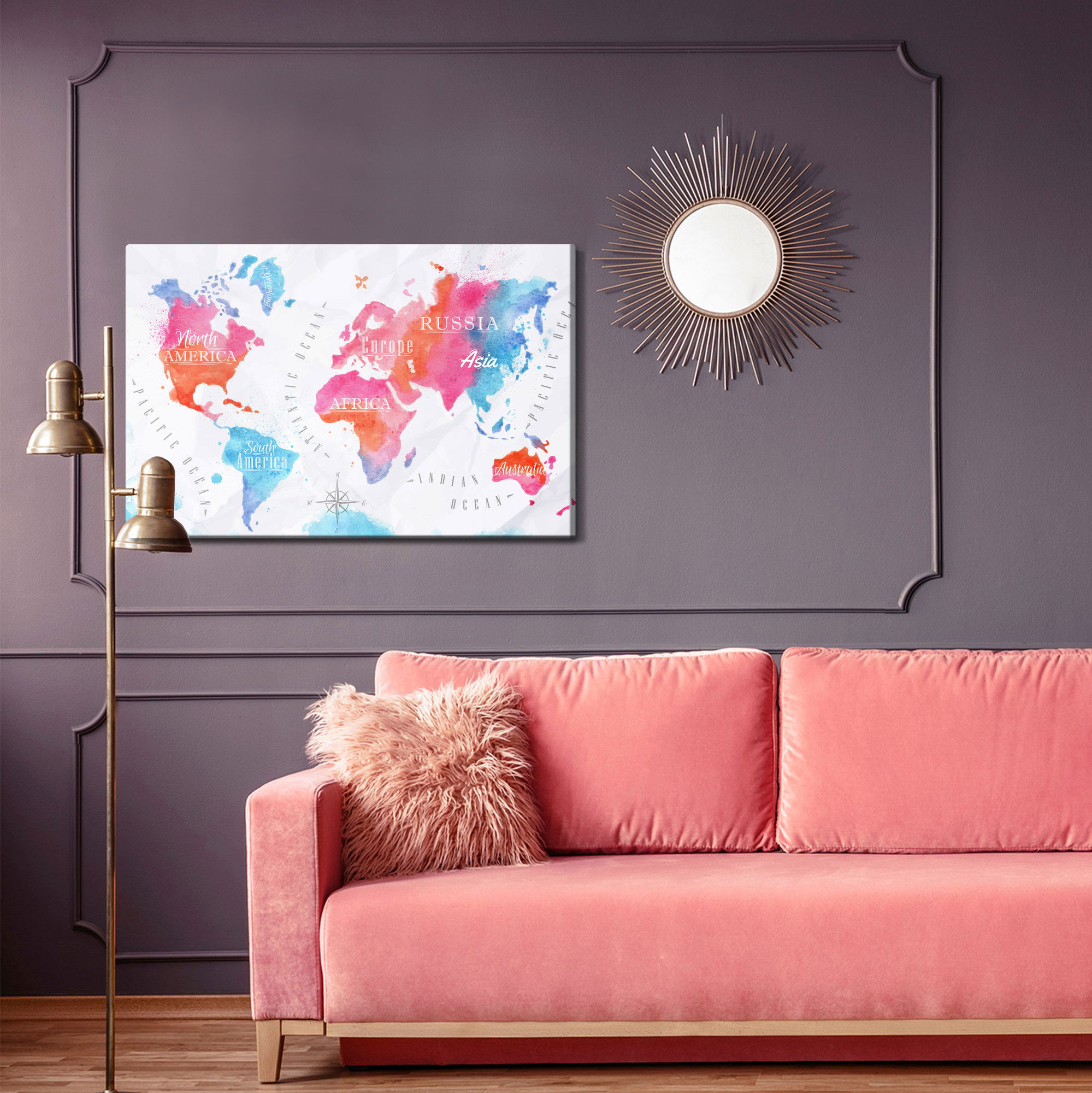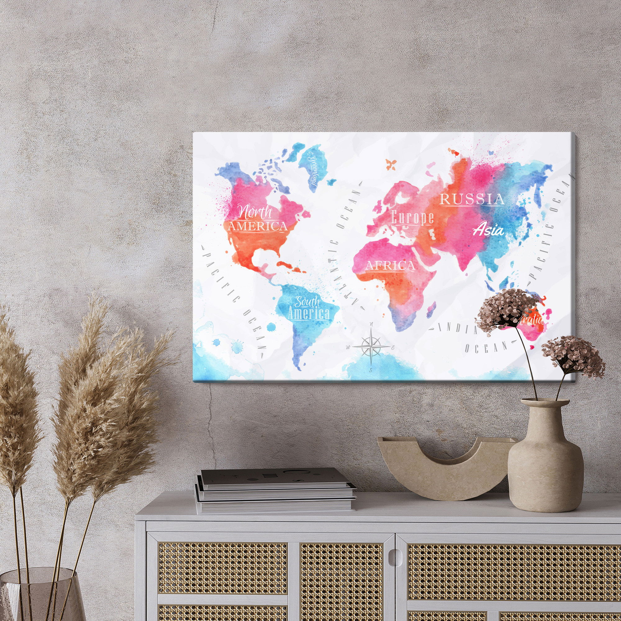 Motivet World map återges med hög färgprecision och detaljrikedom tack vare HP Latex-teknologi. Trycket sker med vattenbaserade, luktfria och GREENGUARD Gold-certifierade bläck som ger en upplösning på upp till 300 DPI. Färgerna är UV-beständiga och behåller sin styrka även i ljusa rum, vilket gör tavlan lämplig för både hem- och offentliga miljöer.