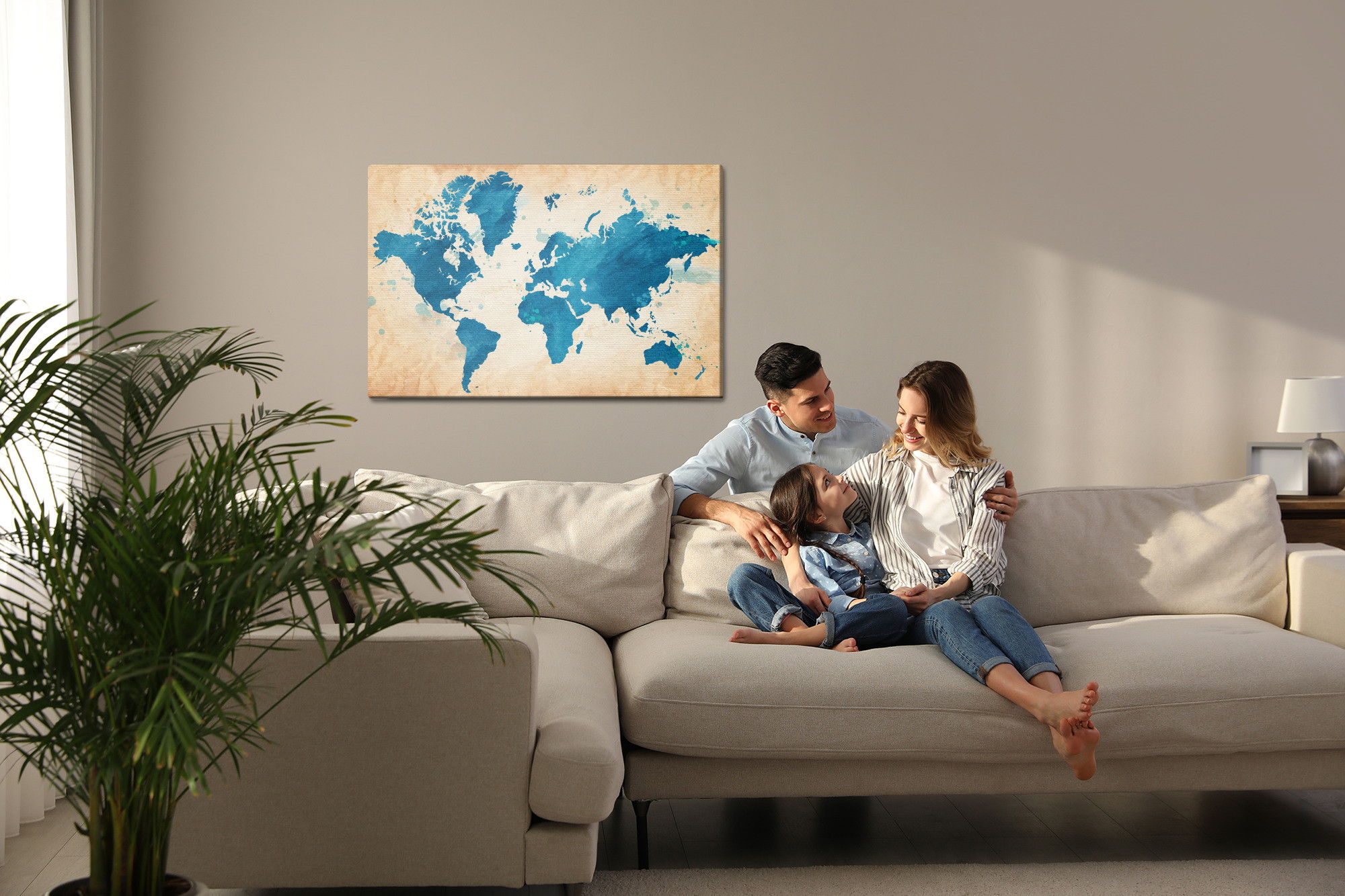 Motivet World map in blue tones återges med hög färgprecision och detaljrikedom tack vare HP Latex-teknologi. Trycket sker med vattenbaserade, luktfria och GREENGUARD Gold-certifierade bläck som ger en upplösning på upp till 300 DPI. Färgerna är UV-beständiga och behåller sin styrka även i ljusa rum, vilket gör tavlan lämplig för både hem- och offentliga miljöer.