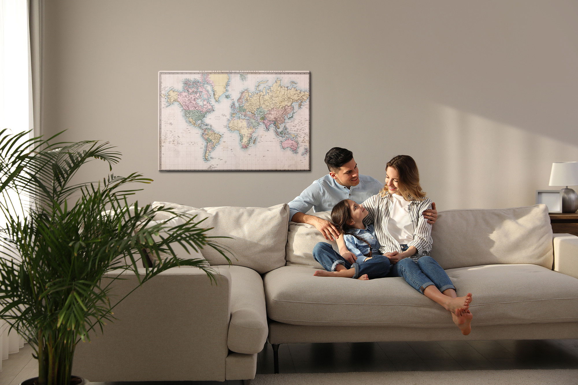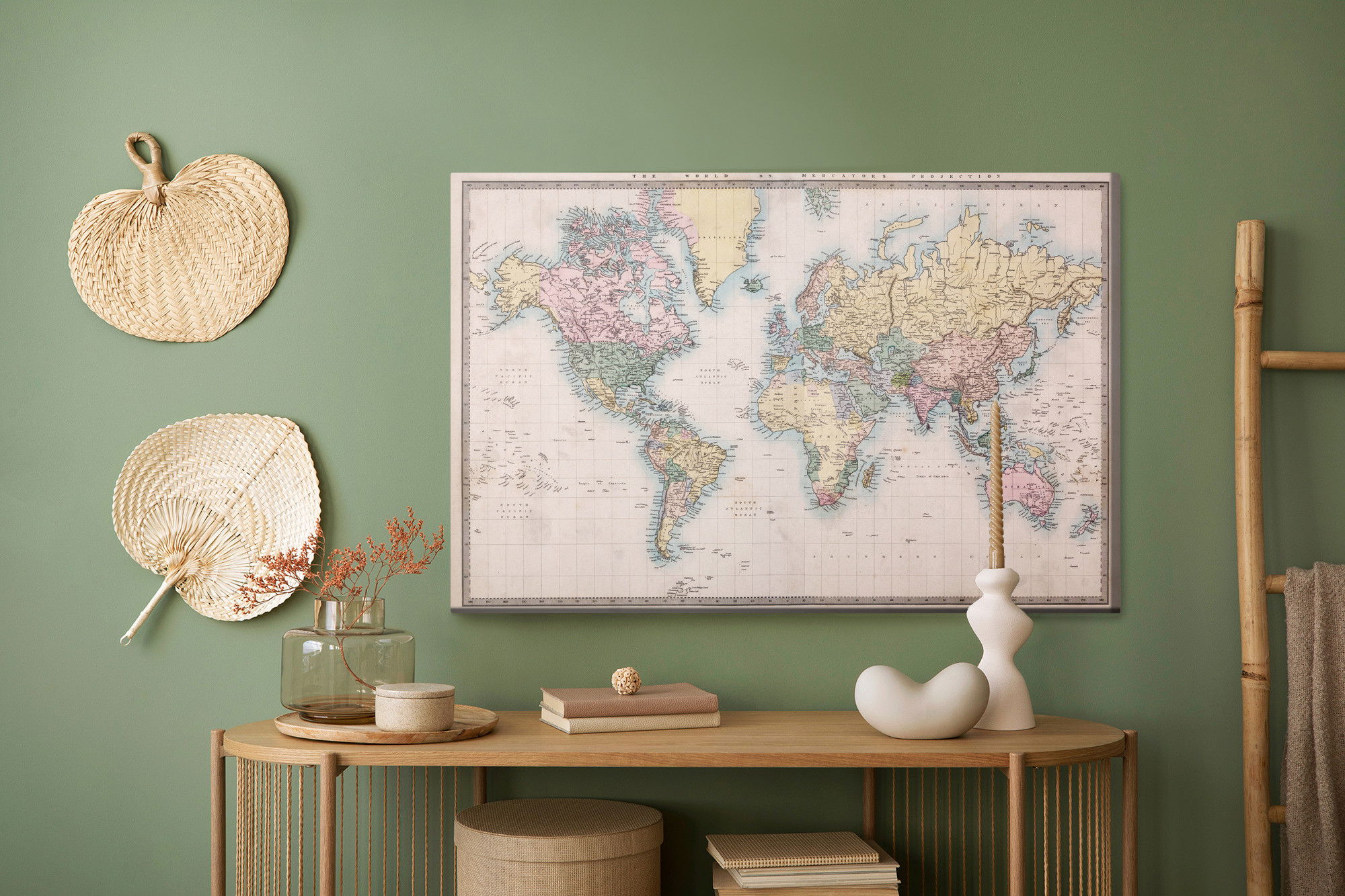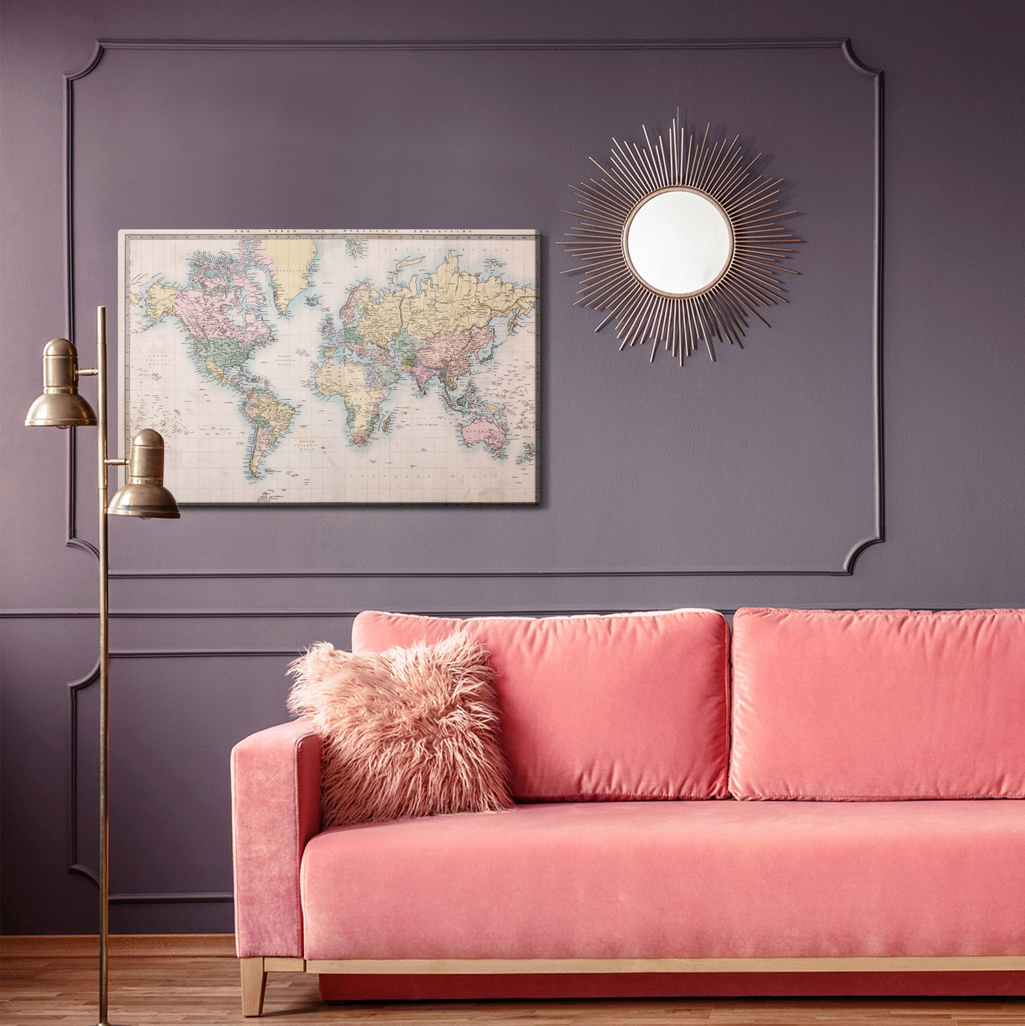 Varje tavla monteras på en massiv fururam. Format upp till 70×50 cm har en ram på 15 mm, medan format från 90×60 cm och uppåt har en ram på 20 mm. Den exakta dukspänningen gör att tavlan håller sin form över tid. Motivet World map in the old style trycks runt hela ramen vilket ger ett stilrent galleriuttryck där tavlan är lika vacker från sidan som framifrån. Kombinationen av rak dukspänning, rena linjer och korrekt tryck ger en professionell finish.