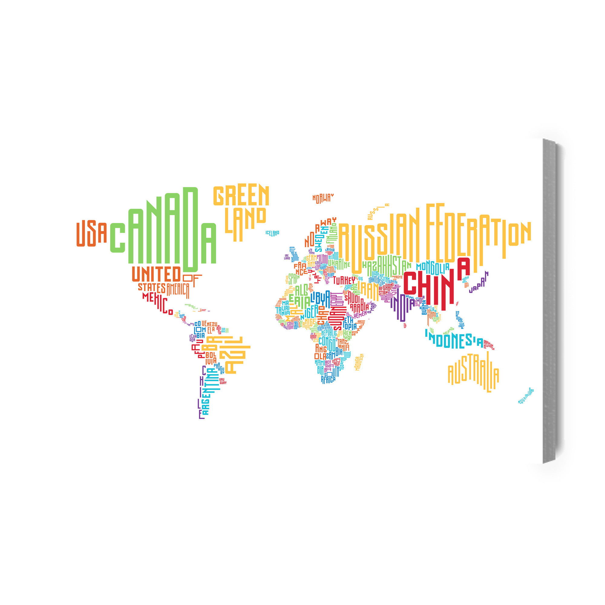 Varje tavla monteras på en massiv fururam. Format upp till 70×50 cm har en ram på 15 mm, medan format från 90×60 cm och uppåt har en ram på 20 mm. Den exakta dukspänningen gör att tavlan håller sin form över tid. Motivet World map - subtitles trycks runt hela ramen vilket ger ett stilrent galleriuttryck där tavlan är lika vacker från sidan som framifrån. Kombinationen av rak dukspänning, rena linjer och korrekt tryck ger en professionell finish.