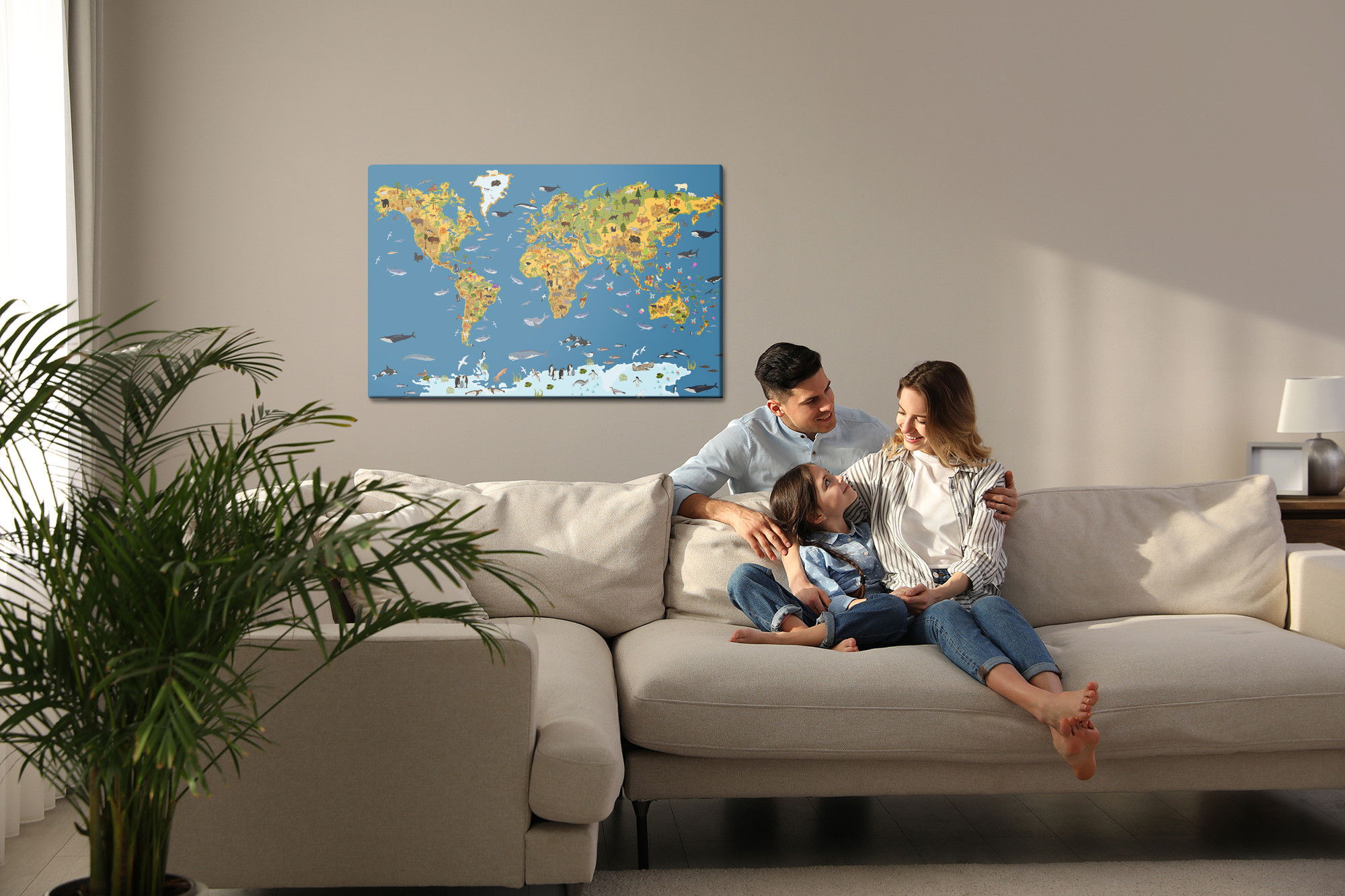 Motivet World map with animals återges med hög färgprecision och detaljrikedom tack vare HP Latex-teknologi. Trycket sker med vattenbaserade, luktfria och GREENGUARD Gold-certifierade bläck som ger en upplösning på upp till 300 DPI. Färgerna är UV-beständiga och behåller sin styrka även i ljusa rum, vilket gör tavlan lämplig för både hem- och offentliga miljöer.