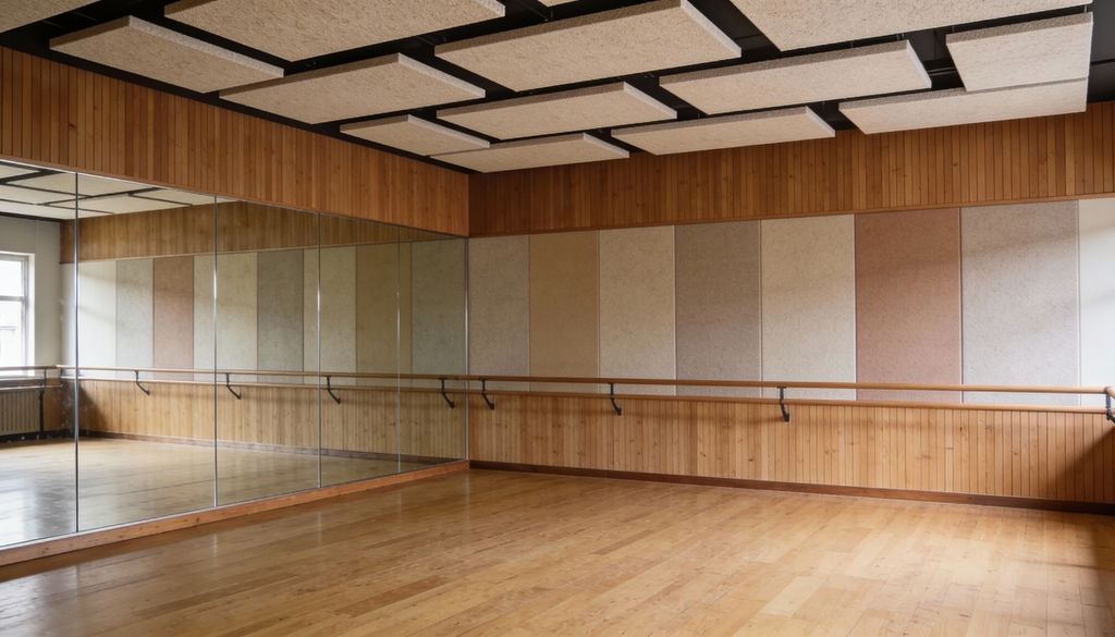 Ceiling absorbers are often the most effective basic measure in larger studio environments such as TV, film, and dance studios, where high ceilings otherwise contribute to long reverberation times.