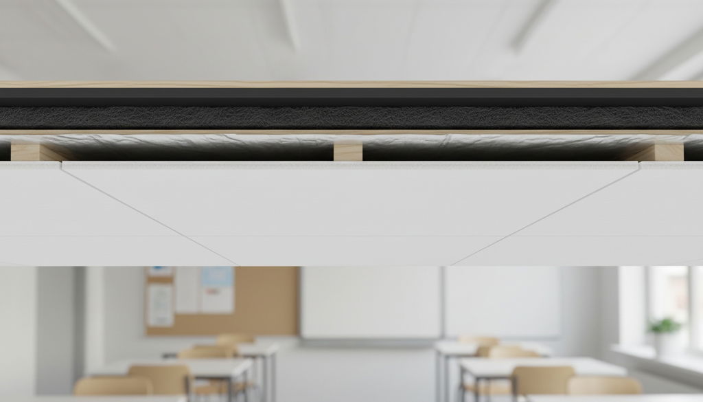Sound insulation of ceilings should not be confused with sound absorption. While ceiling insulation stops sound between floors, sound-absorbing solutions are used on walls, ceilings, sound-absorbing curtains, or room dividers to reduce echo and reverberation within the same room. In school environments, these measures are often combined to both limit sound propagation and improve the overall sound environment in classrooms and common areas.