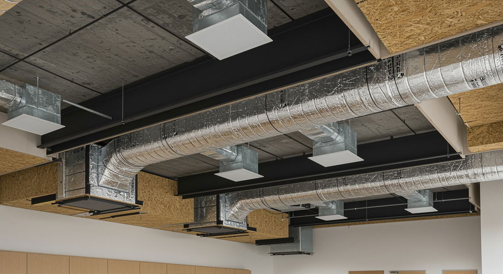 Typical problems are experienced as a constant hum, whistling noise, or recurring vibrations that can be heard in classrooms, libraries, or offices. Ventilation located near classrooms, fan rooms above classrooms, or equipment in basements can create noise that spreads vertically through joists and walls. Because the sound is often low-frequency, it is perceived as particularly disturbing and difficult to ignore.