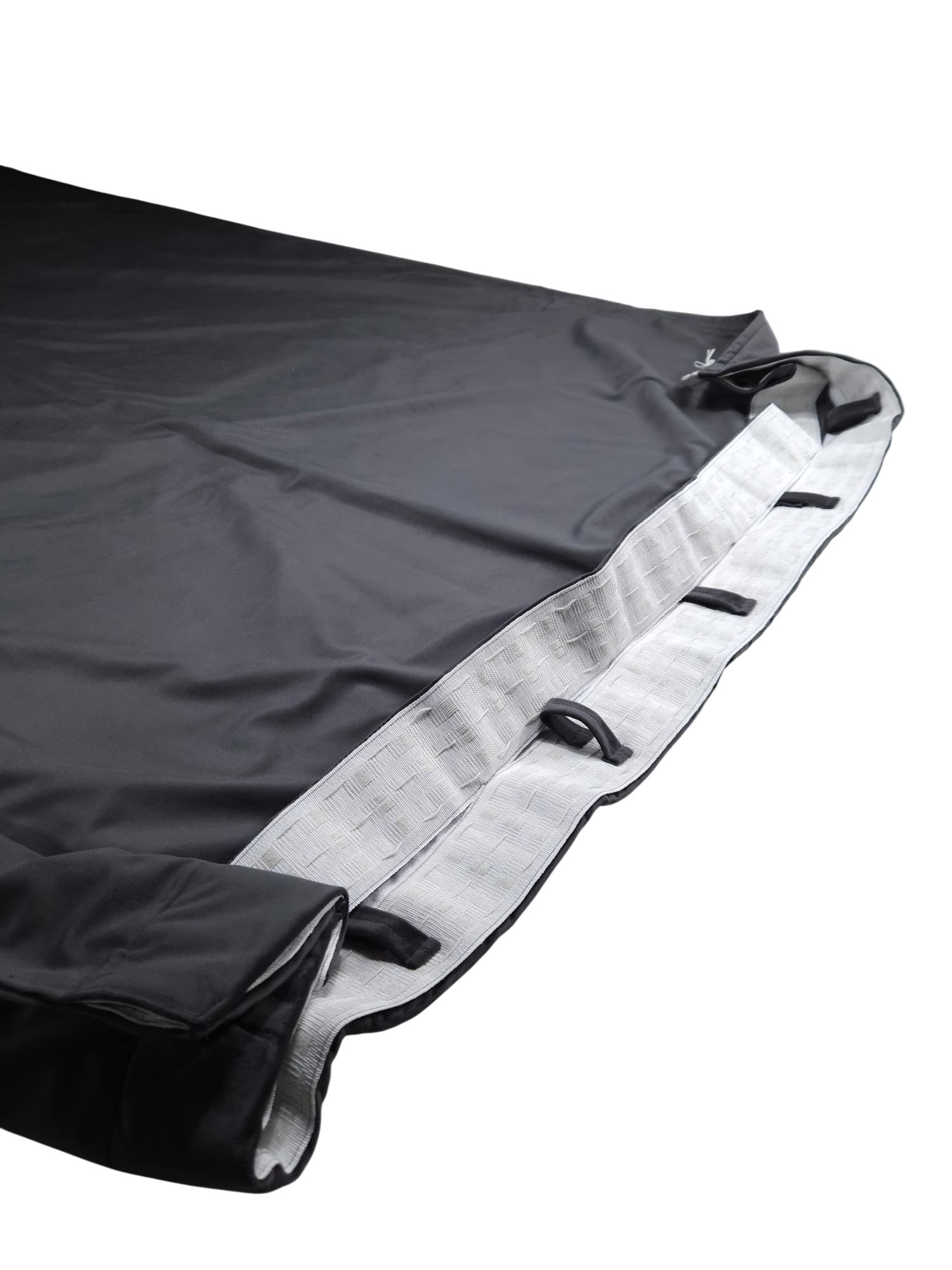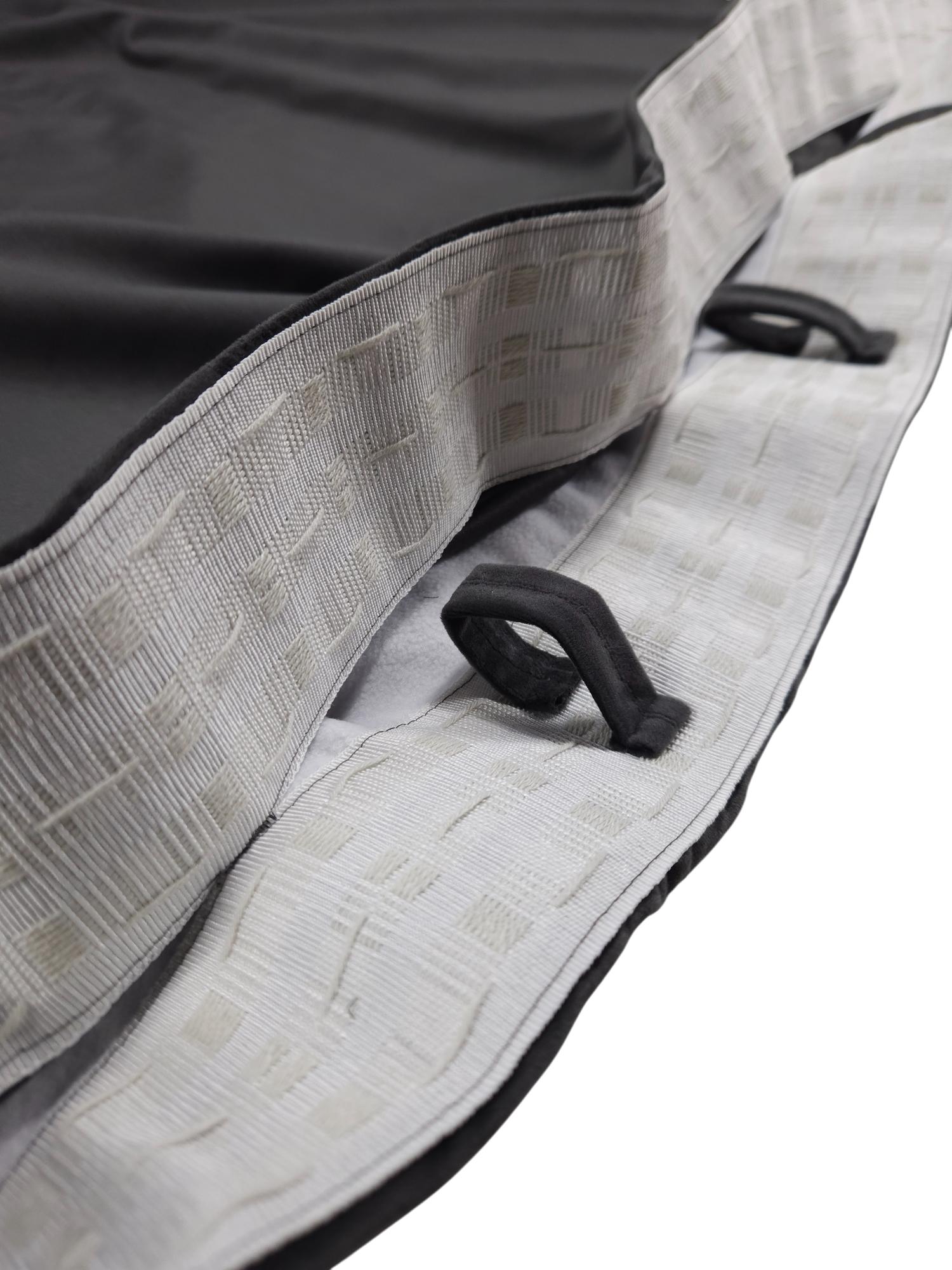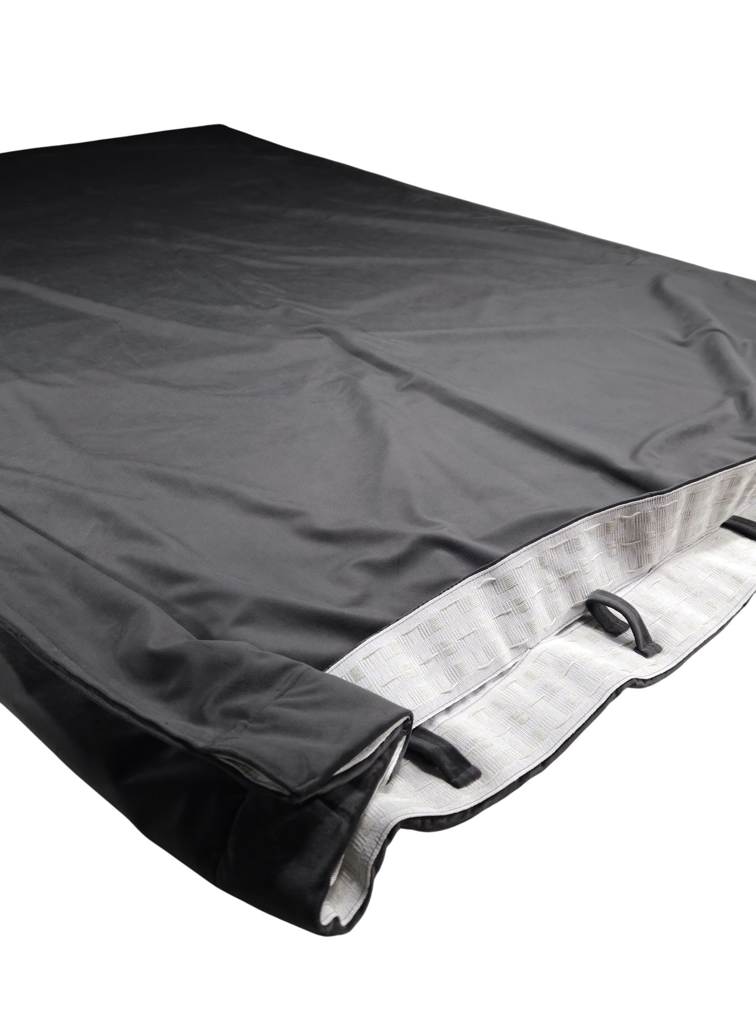 | Material | Framsida: Tungt velourtyg i 100 % polyester. Mellanlager 1 (tillval): Mörläggningsmaterial i 100 % polyester. Mellanlager 2: Akustisk fleece i 100 % polyester. Baksida: Tungt velourtyg i 100 % polyester. |